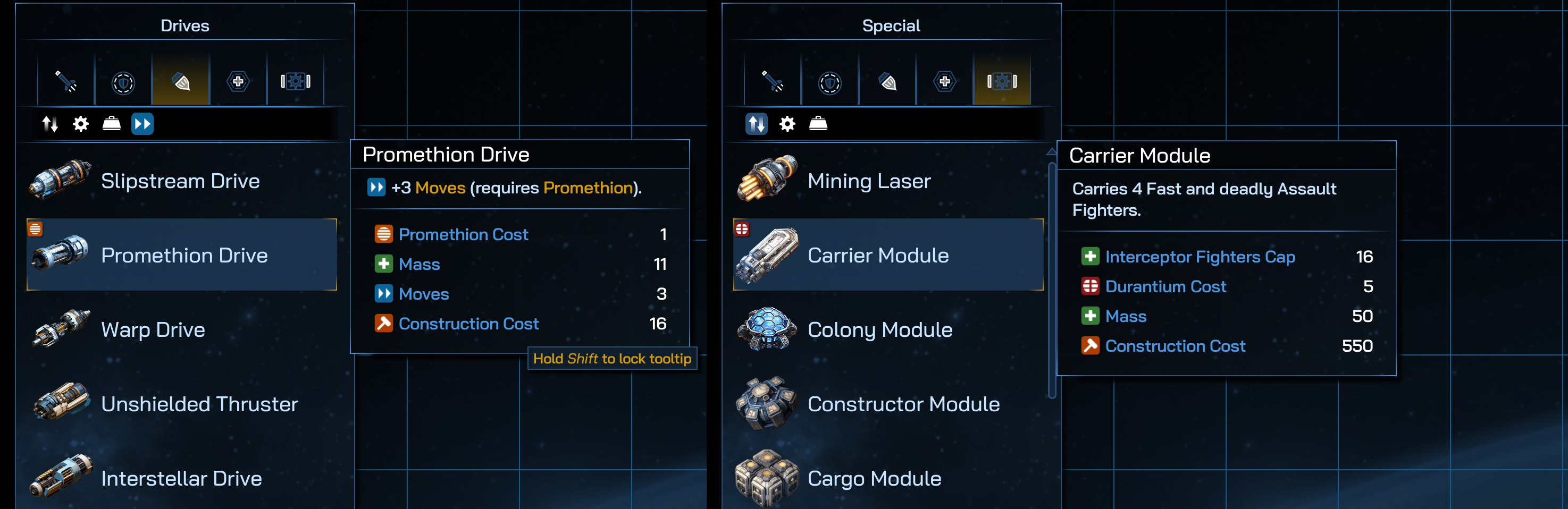 This isn’t to say that Durantium and Promethion don’t also have a role in ship construction. Durantium is used to construct powerful Carrier Modules and is required for the Extended Reinforced Hull Flagship upgrade, while Promethion is used to increase a ship’s Moves with several Drives.