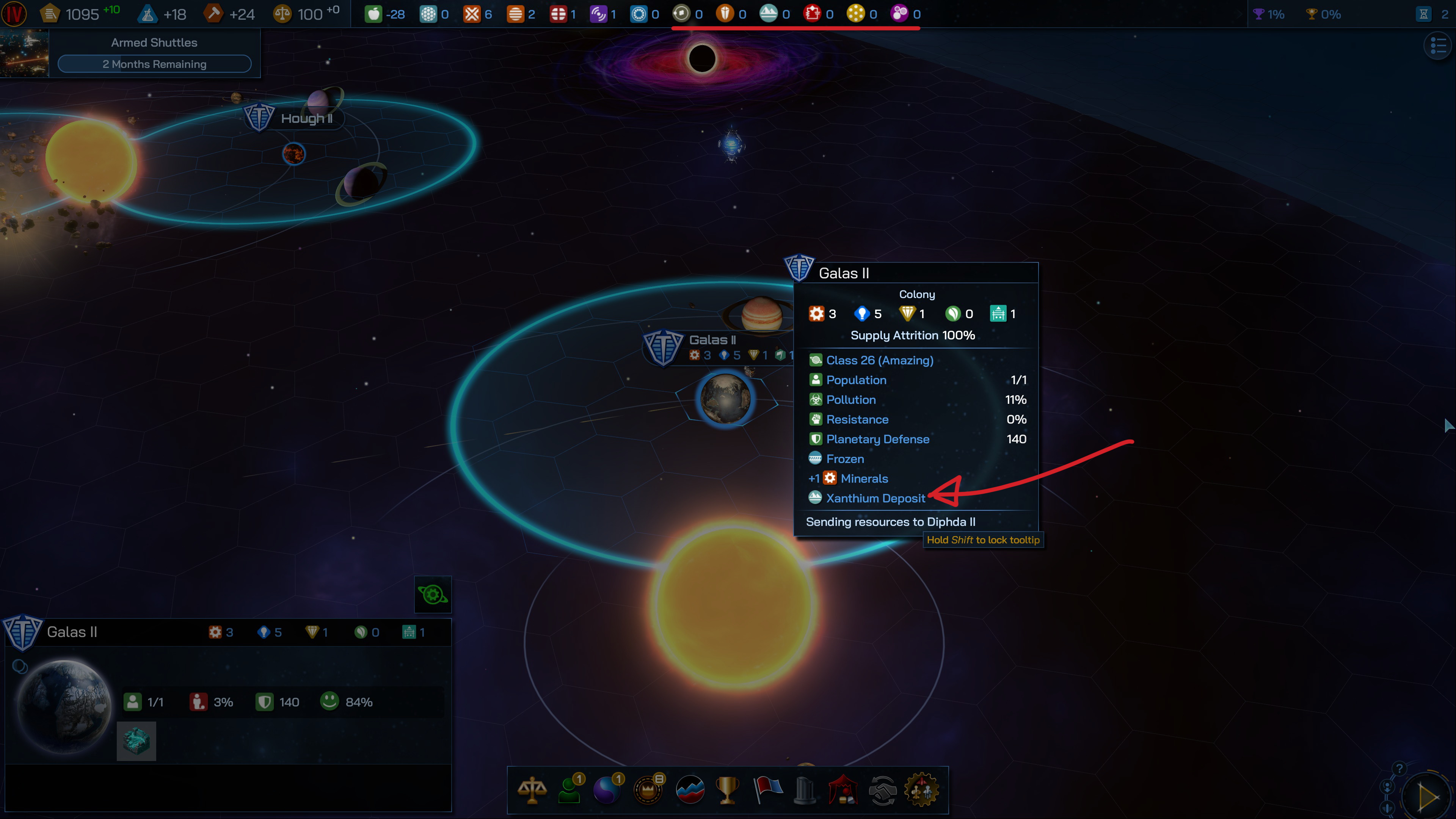 Elerium and Antimatter are unique in that they don’t spawn around stars but are found inside Nebulae and around Blackholes, respectively.