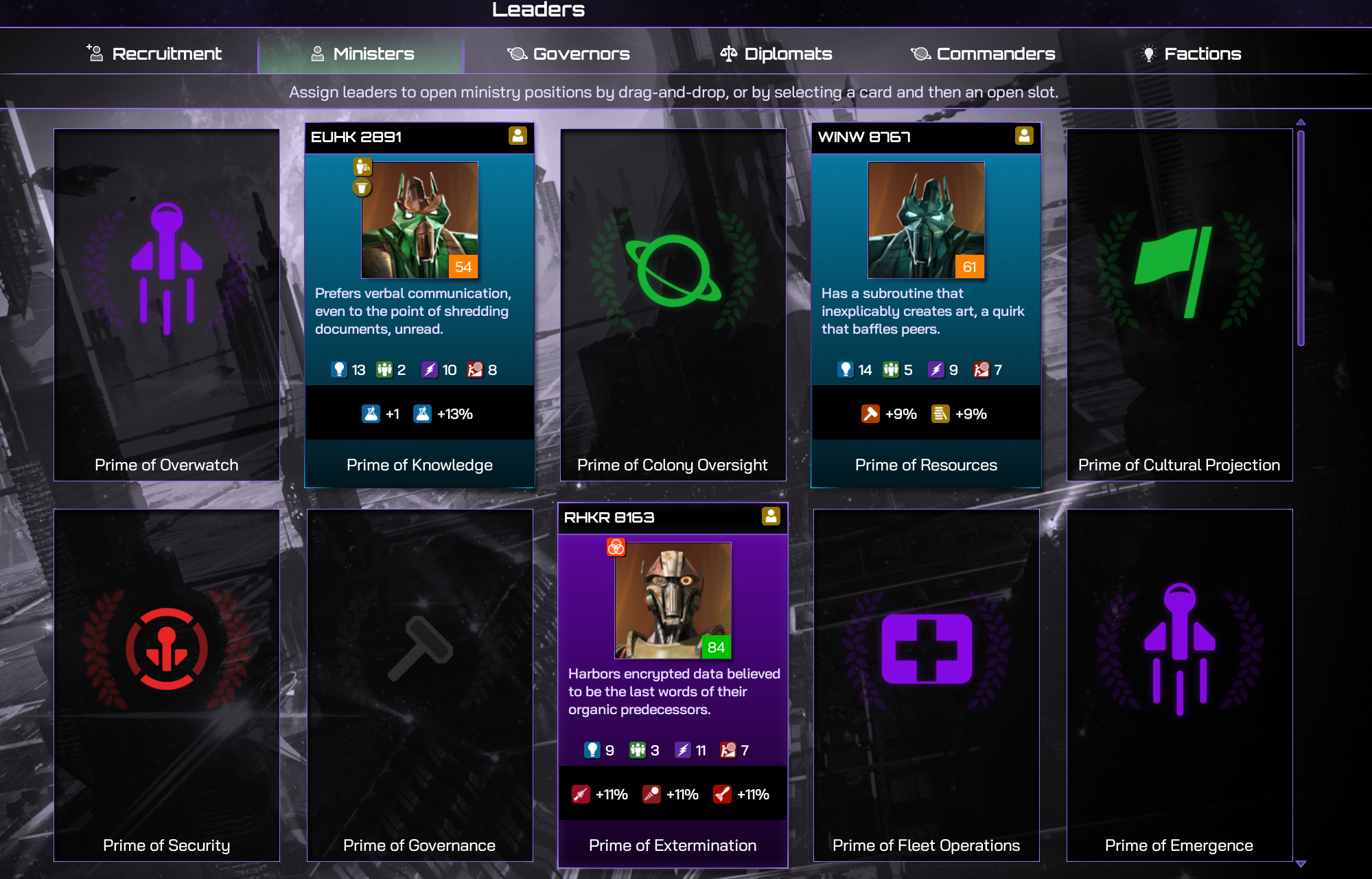 The Nyx don't have ministers. They have Primes and they have a very different philosophy how their government should be handled and what traits matter.