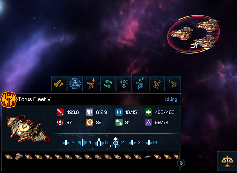 In the screenshot above, you’ll see the first three ships that could make it to the destination hex this turn, with the final ship, with no remaining Move points left, set to automatically arrive and join the rest next turn.