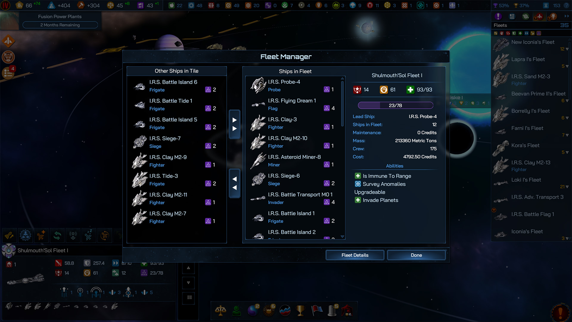 Next, we’ve added the Fleet Manager screen itself. Here you’ll be able to select a fleet and then more easily add and remove individual ships located the same hex. Essential information is displayed on the right of the screen, including Logistics allowance, the number of ships and any Abilities that member brings along to affect the fleet as a whole.