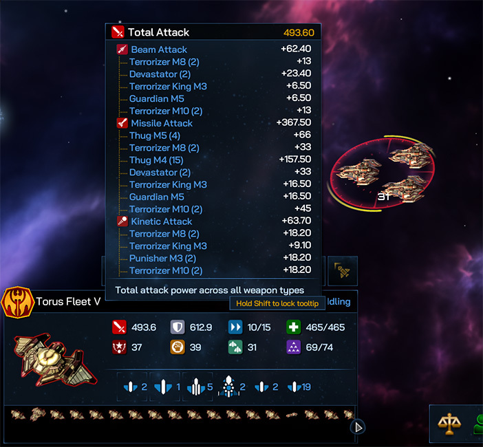 Next, while we’ve kept a ship and fleet’s Combat Rating score for an at-a-glance overview of how well it is likely to perform in combat, we’ve now separated out its Attack and Defense values into separate indicators, the tooltips for which show a detailed breakdown of what individual ships, components and other modifiers are contributing towards those specific values. These are handled slightly differently for ships and fleets respectively, where ships will show components and with fleets showing individual contributing ship values instead. This was a much requested feature, particular from veterans of the series, who felt these two Attack and Defense values should be available without having to dig for it within existing tooltips.