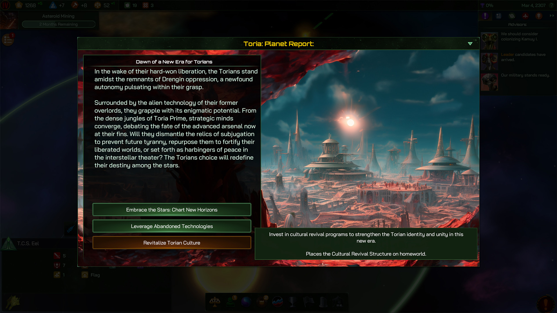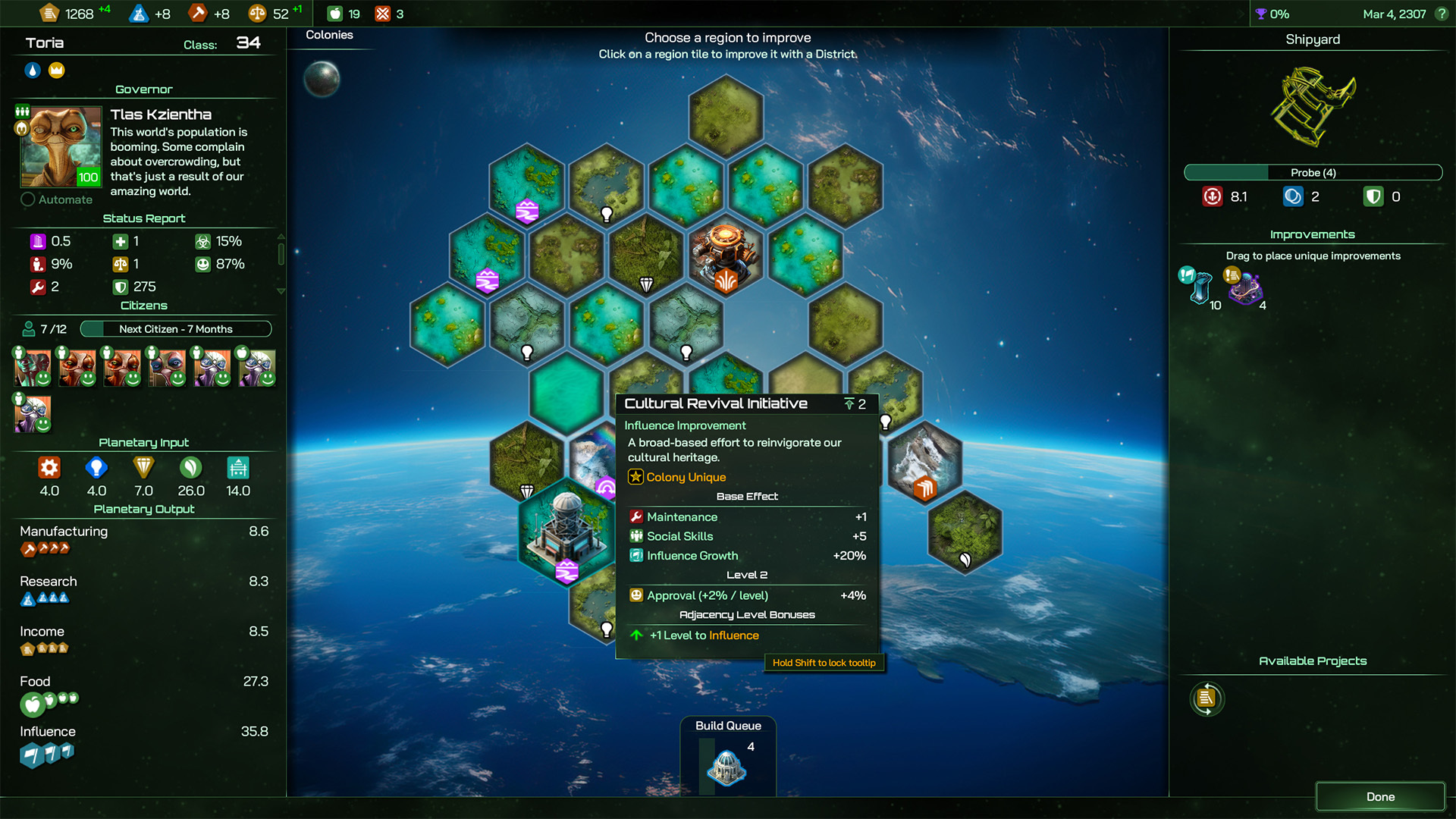 The Torians were always cultured lot, and picking the Cultural Revival Initiative will give each Citizen born and bred on Toria a +5 Social Skills boost. This is a powerful effect, especially used in tandem with the Tide Pools colony Improvement, allowing the Torians to mitigate many of the worst effects from Crime, Pollution and other effects that hit Approval hard. Another option, perhaps, is to focus their efforts on building a strong core group of Traders, and the increased Income they generate across your empire.