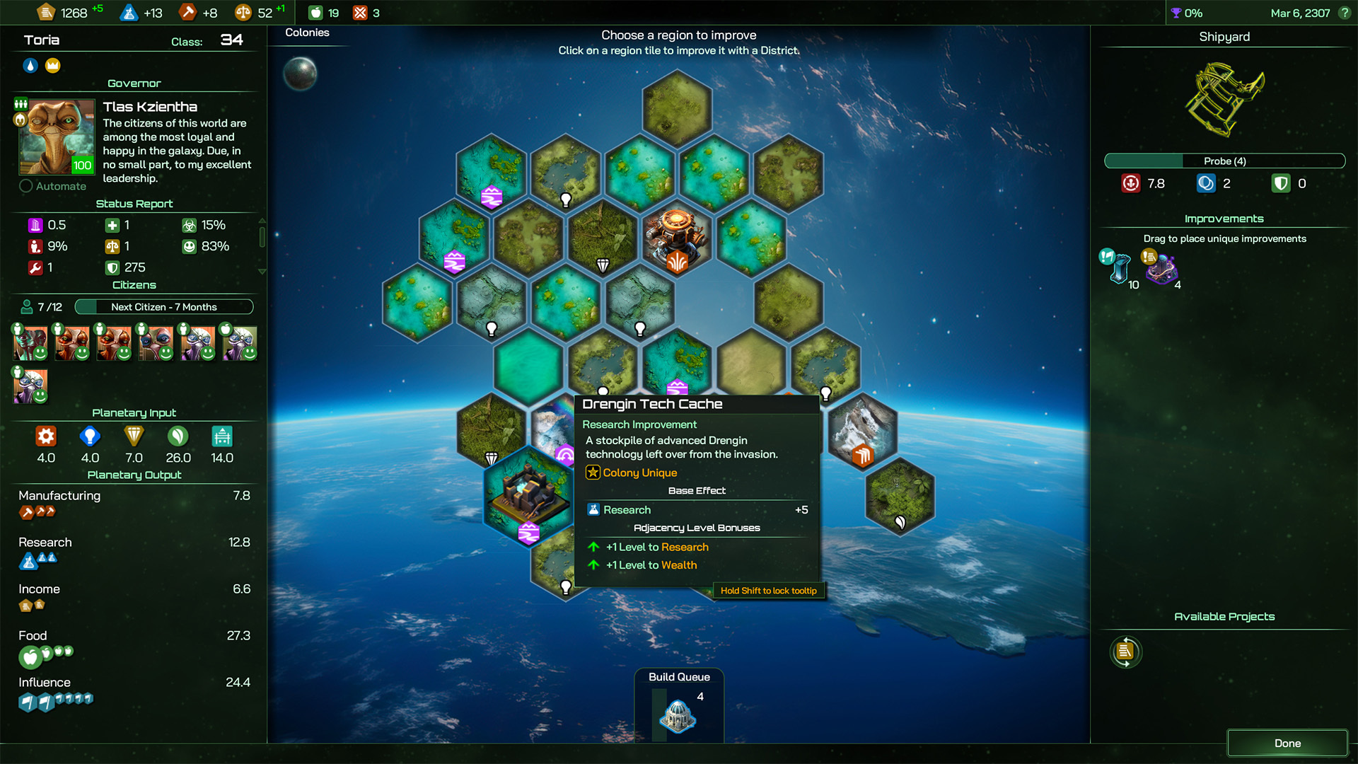 The Drengin Tech Cache grants the Torians access to some of the advanced technology left behind during the occupation by the Drengin Empire, granting nice early +5 Research Bonus and allowing the Torians to make a tidy profit from manufacturing and selling these in their financial Districts too, granting a Research and Wealth bonus to attached infrastructure.