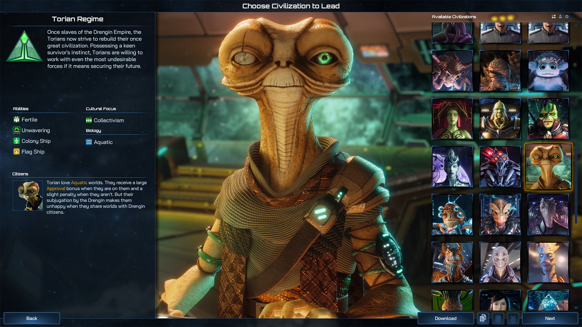 The Torians were a peaceful Aquatic species that became subjugated by the Drengin Empire very early on in the history of Galactic Civilizations. After fighting a dreadful war of rebellion, they broke free of their shackles and now are free to take their own destiny into their hands. Never again will they be slaves, and their mistrust of those other civilizations in the galaxy lies at the heart of their core skills. Fertile ensures they expand and populate their worlds very quickly, while Unwavering ensures they’re difficult to Culture Flip and have diplomatic abilities to both Persuade and Threaten when necessary.