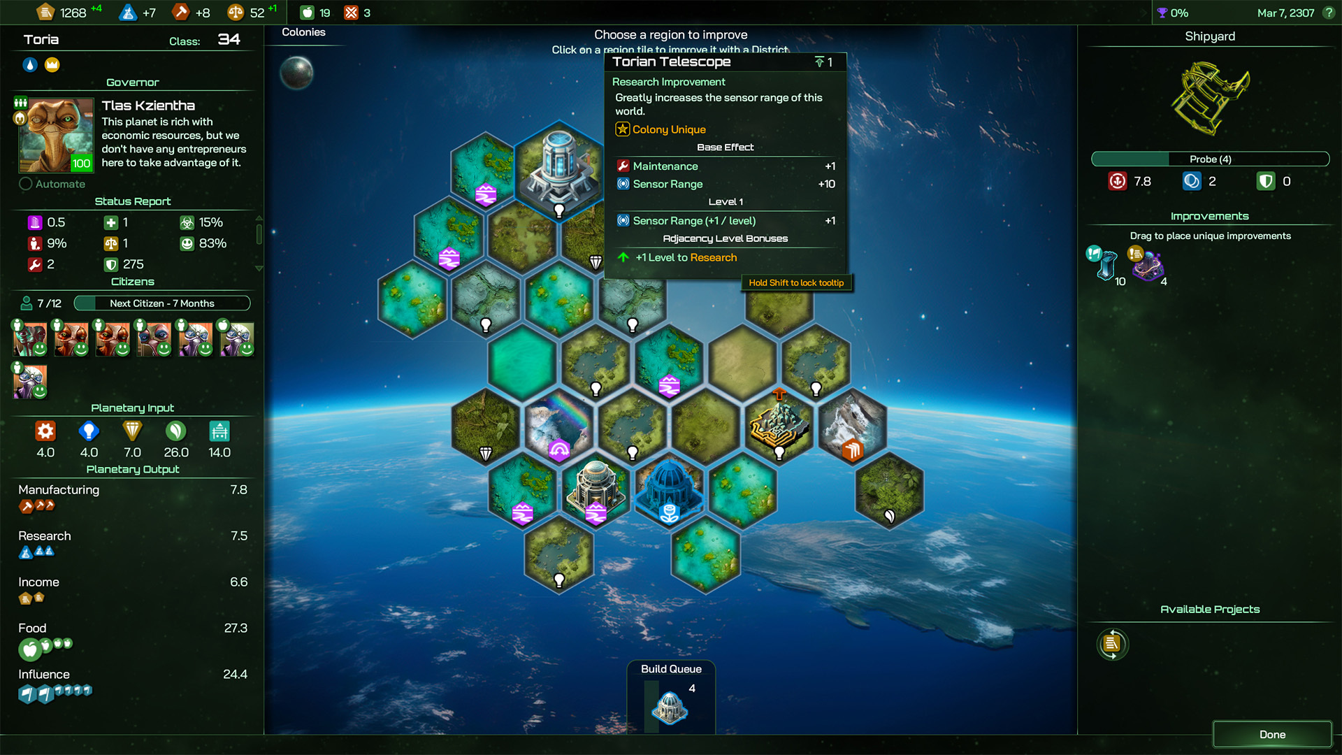 The Torian Telescope here gives a +10 boost to Sensor Range, and more if located next to other Research Districts or Improvements, while helping to boost those attached zones too.