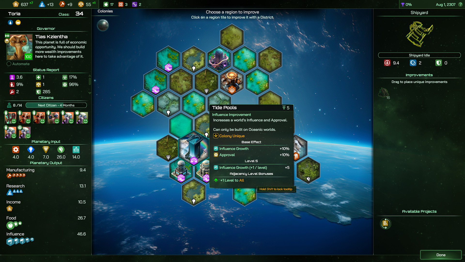The Tide Pools is a Colony Unique Improvement that provides a +10% bonus to Influence Growth and Approval respectively. Influence Growth can be crucial to fast expansion of borders, while the Approval bonus can help offset those sad feelings that Aquatic Citizens might feel being stuck mining Durantium by hand on a baking hot, dry Volcanic world long after moisturizer cream supplies have run out.