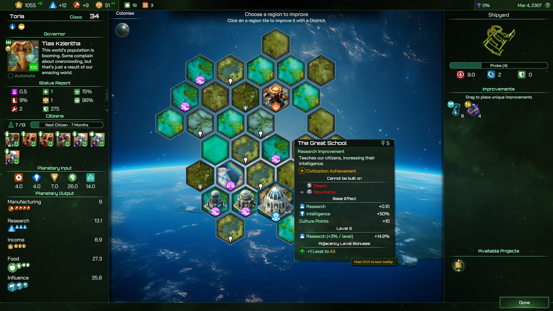 First up is The Great School, a magnificent university attended by the smartest of Torians, immediately raising the overall Intelligence of Citizens born on this world by 50%, and granting a Research boost. These Citizens can either be used to focus Research on the Core World it is built upon, or perhaps you hothouse their Growth and send them off to far-flung colonies to help your Research and Income generation efforts there instead. As a bonus, it’ll give a +1 to All Adjacency Bonus to reflect the utility in placing a university full of academic swots next to your other various economic and industrial zones.
