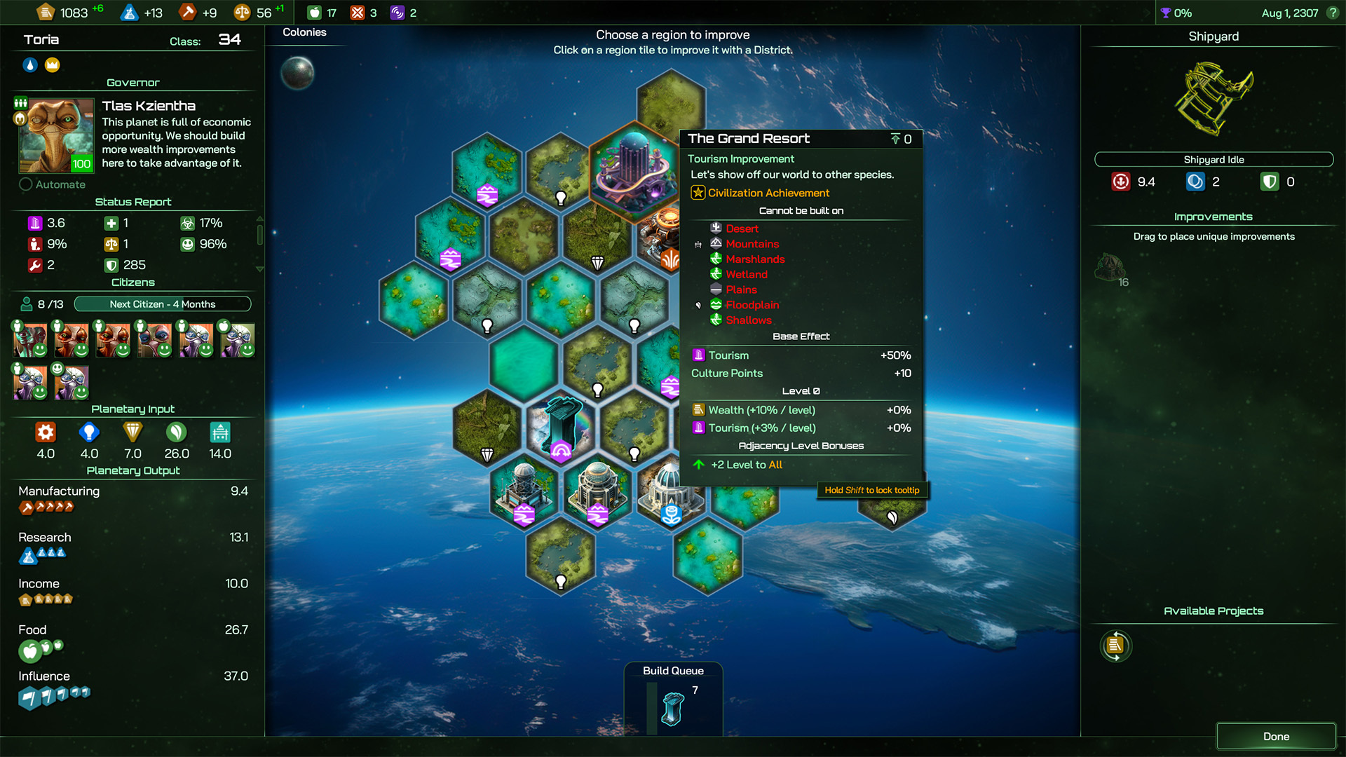 The next Civilization Achievement Improvement available for construction at the beginning of the game is The Grand Resort, a luxurious dream vacation destination for any sentient creature in the galaxy. This provides a 50% bonus to Tourism and +10 Culture Points, with some additional Wealth and Tourism benefits if carefully located. Again, a +2 Level to All Adjacency Level Bonus ensures that the Torians can squeeze even more out of adjacent Districts and Improvements.