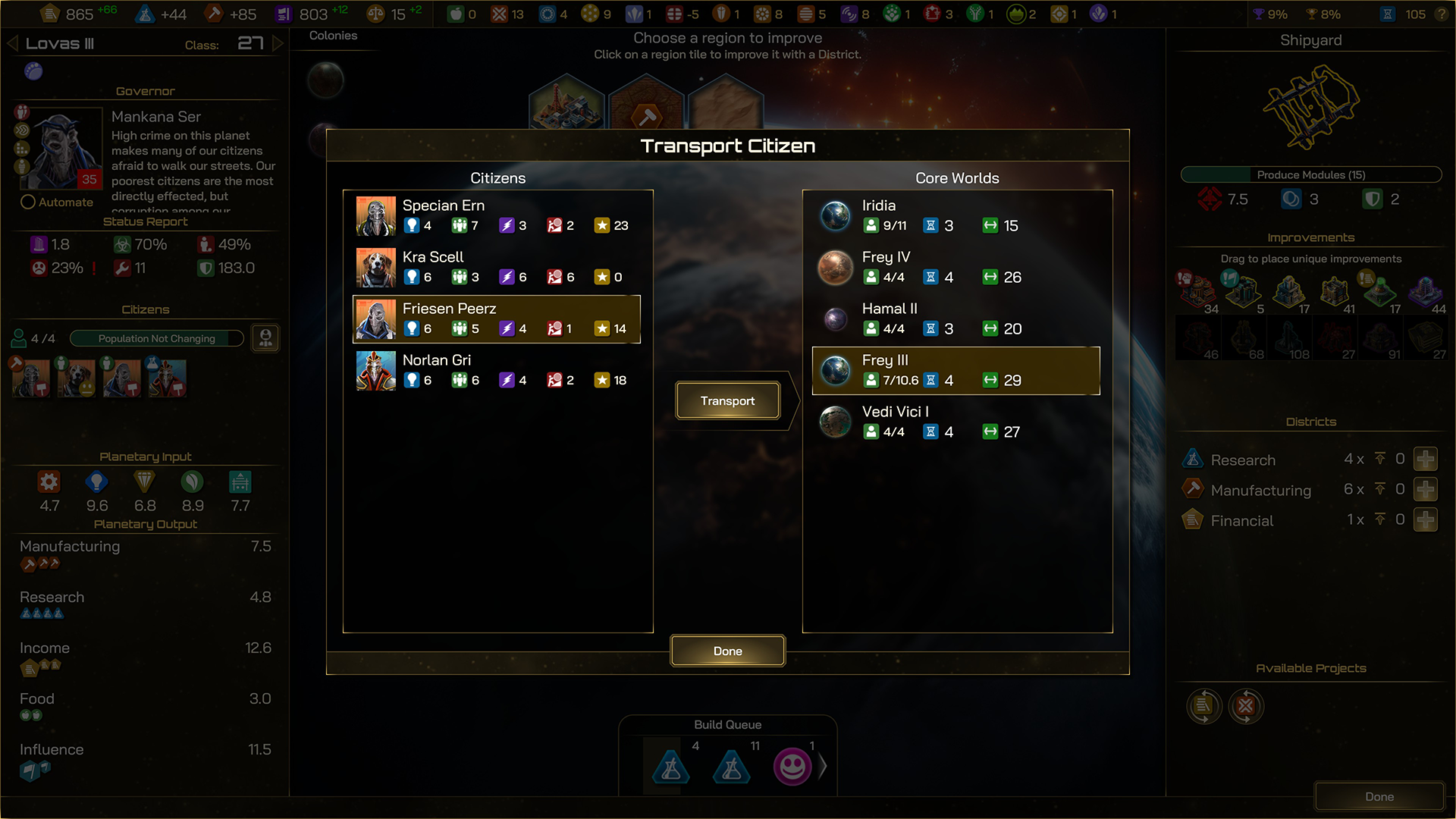 Additionally, the update introduces a highly requested feature for [b]Citizen transportation[/b], enabling the instant transfer of Citizens between Core Worlds. This strategic addition not only enhances population management but also opens new avenues for optimizing and expanding your civilization across the galaxy.