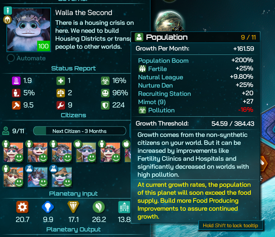 In the above example we can see that this Mimot world with nine Citizens will be adding +27 to their Growth rate (Mimot grow very quickly with each Citizen giving +3 Growth), on top of a whole host of other modifiers they get: they’re using Population Boom for a +200% Growth bonus, the Nurture Den, the Natural League Faction and the Recruitment Station Orbital Improvement are also assisting here too.