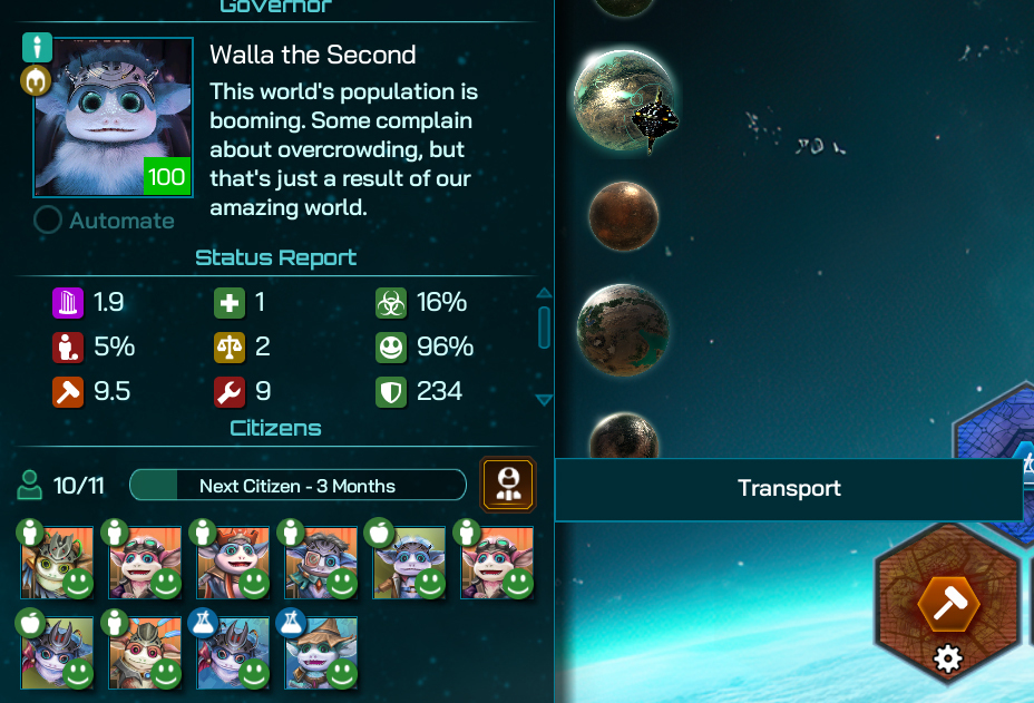 With the ability to efficiently move your Citizens around your empire, we can now more easily implement a classic space 4X strategy where a planet is selected for the hothousing of Citizen growth, and using that planet to rapidly increase the population of newly colonised Core Worlds.