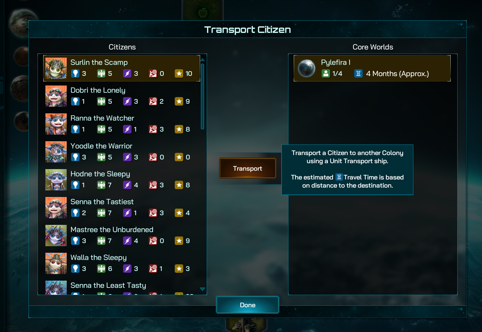On the Transport Citizen screen that opens, select the Citizen and the target Core World destination, then hit Transport after checking the estimated Travel Time and Surlin the Scamp here is off to bolster the numbers of a frontier world.