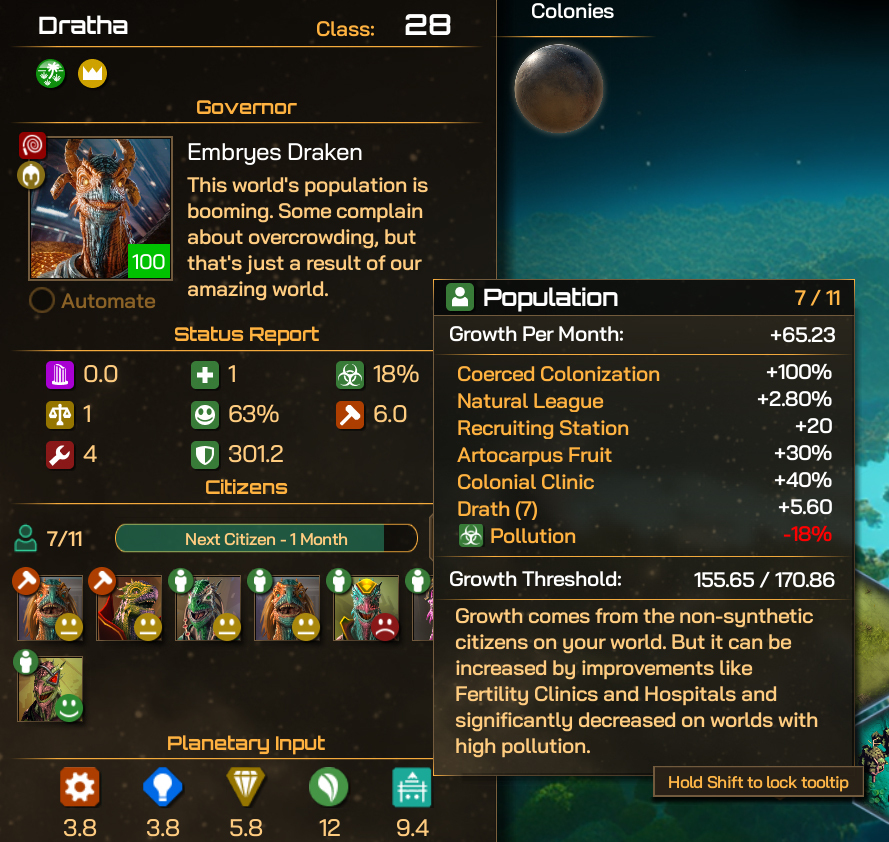 The Drath grow slowly compared to the Mimot, and get a small penalty to their Growth, with seven Citizens only generating 5.6 Growth altogether, before the other modifiers, but they do have access to the Coerced Colonization Policy for a +100% bonus, and Artocarpus Fruit increases this further. There’s a Colonial Clinic giving a large +40% boost too, although that is quite expensive to build in terms of Manufacturing and requires a little Durantium too.