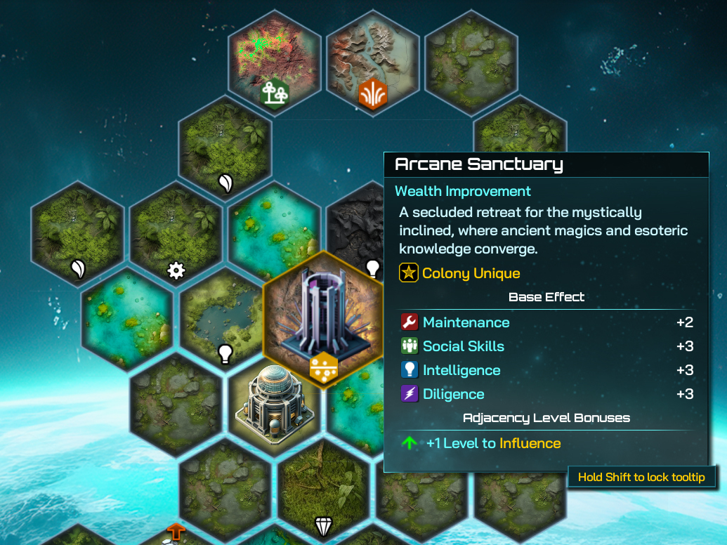 The second option from this Event is the Arcane Sanctuary, a rather expensive Improvement in terms of Maintenance but providing a huge +3 boost to Social Skills, Intelligence and Diligence. For those players who like to put their Citizens at the front and centre of their civilization’s growth, and like to keep large population numbers, this could be a very powerful strategy for the Altarians.