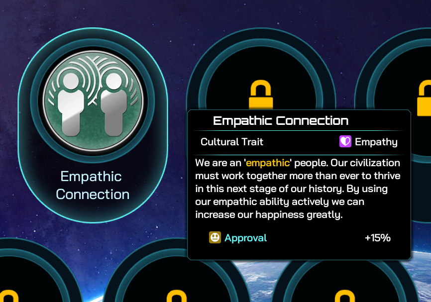 Finally, within the first few turns the Altarians get access to the Empathic Connection Civilization Policy that comes from their Cultural Trait “Empathy”, granting a +15% Approval bonus for free! Approval is one of the most punishing mechanics in GalCiv IV, and for good reason: push your people too hard, and they’re gonna push back by refusing to work or research for you. Any tool that boosts Approval allows you to push your people harder: more taxes, more colonies, more production.