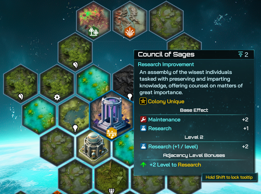Finally we have the Council of Sages, which provides a flat +1 Research and a flat +2 Level to Research as an Adjacency Level Bonus. This will provide a strong Research centrepiece when surrounded with like Districts and Improvements, and makes for a strong early-game play to push for the later Research tiers and those sweet high-tech goodies they bestow. If you’re not overpopulating Altaria, instead playing with less Citizens and going for Districts and Improvements for your Research instead, this could be a solid choice.