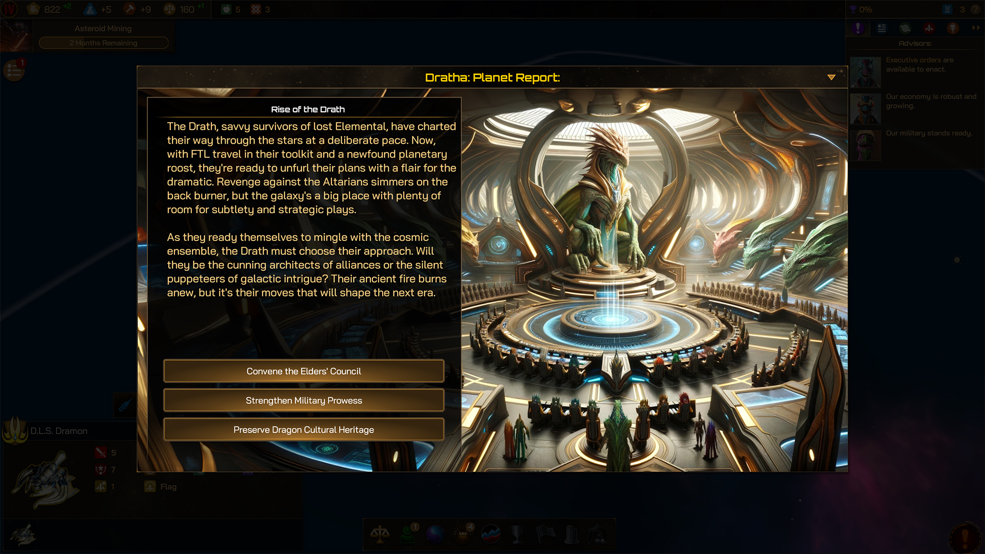 The Tales of Centauron DLC adds a homeworld Event that kicks in soon after the game’s start, as always presenting the Drath with a choice between three new homeworld Improvements.