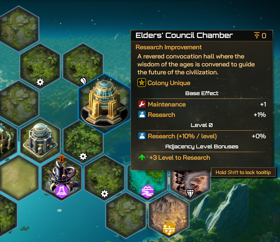 But that’s not all! This is a powerful Wealth Improvement that not only grants a large +25% to the Core World’s Gross Income, but also boasts an impressive Adjacency Bonus: +3% per level to both Gross Income and to Research.