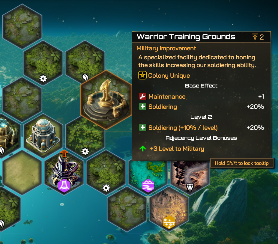 Next up is the Warrior Training Grounds. Sometimes, even a shadowy collection of sneaky warmongering lizards need to get their claws dirty, and so once more the Drath Freehold turn to the wisdom of their long, dark past. The Warrior Training Grounds instil young Drath Soldiers with the martial history of their people and increasingly… draconian training regimes that grant Dratha a massive +20% to Soldiering, and a further +3 Level to Military Adjacency Level Bonus.