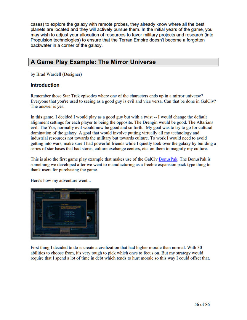 The GalCiv series has had this idea baked into it from the very first iteration. I can still fondly remember reading the instruction manual to the first version of Galactic Civilizations that Stardock released on Windows way back in the early 2000s, and this guy called “Brad Wardell (Designer)” had written a little piece in there.