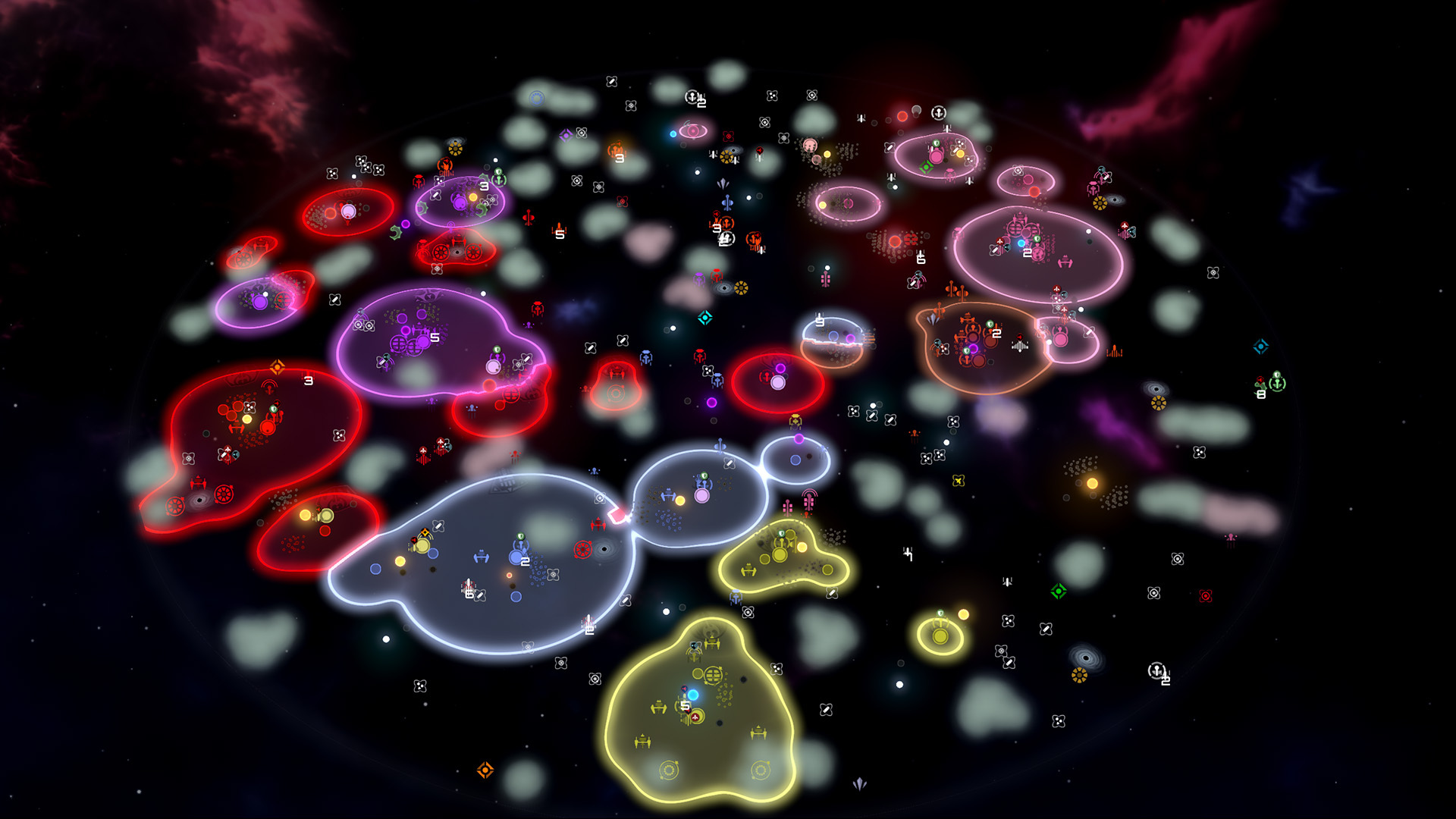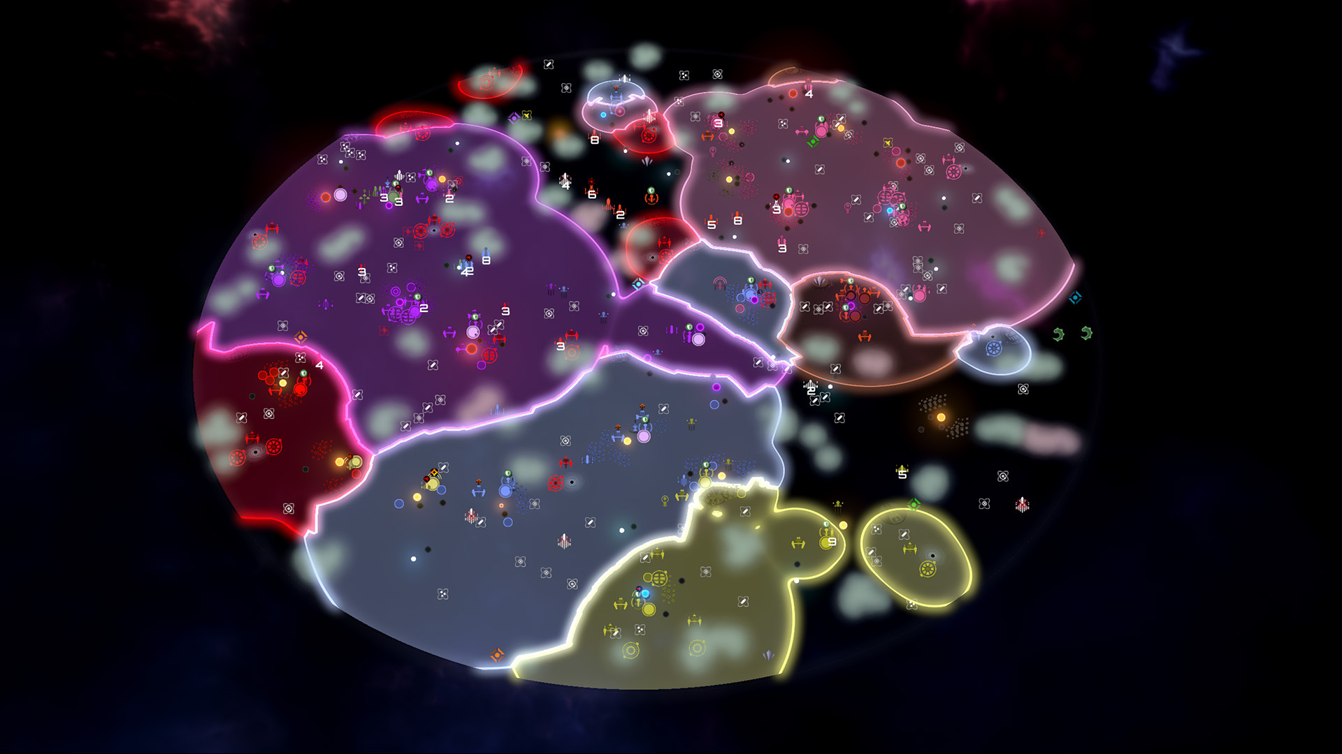 Here’s the game state at turn 150. The Terran Resistance is holding on,n but the Yor and Festron are looking very strong, having mostly eaten their neighbors. This is the AI playing itself, of course, but I suspect most casual players would find this scenario fairly difficult. My money is on the toasters.