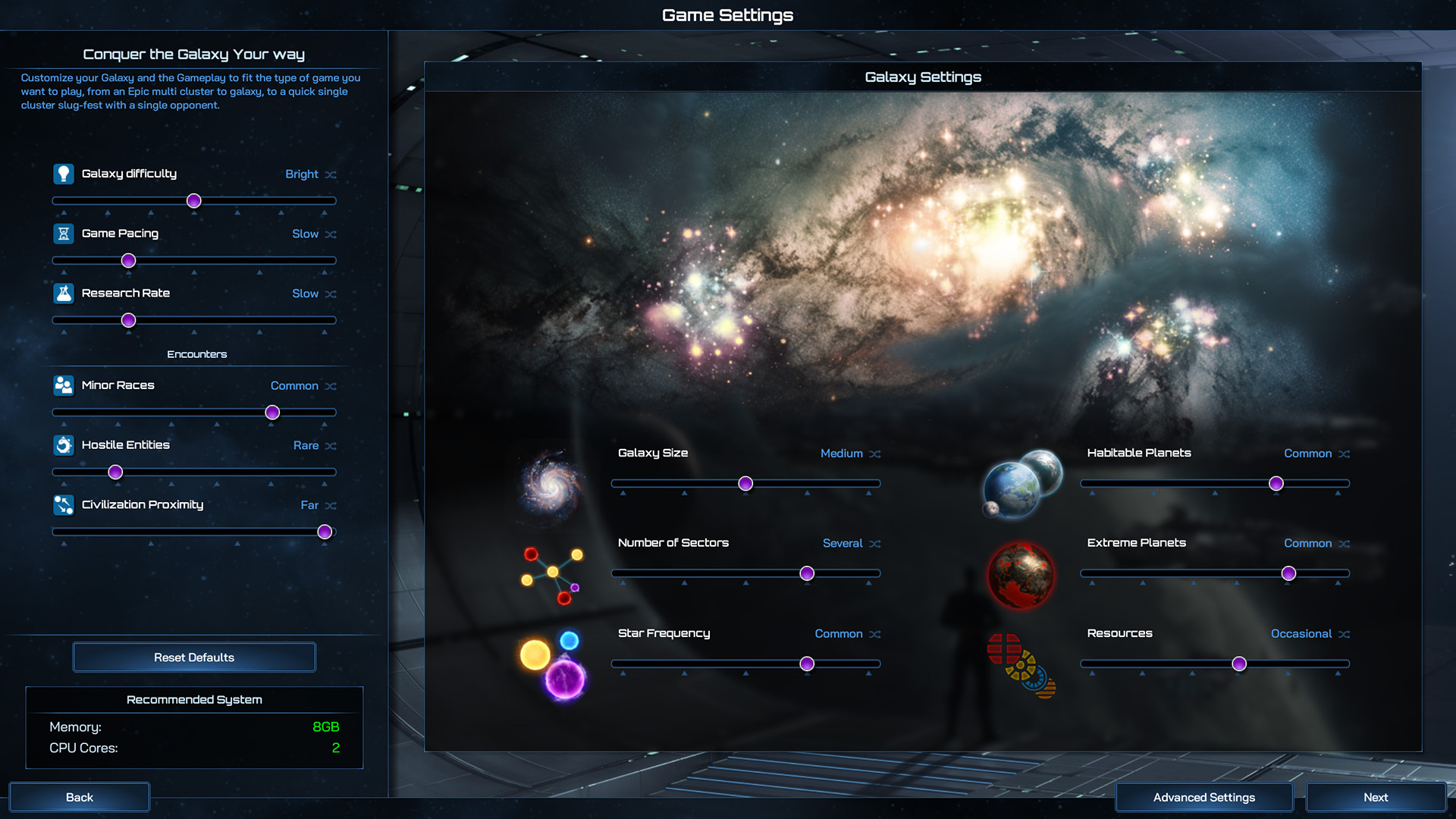 We want a big ma, with plenty of space to expand into, lots of worlds to colonize, and fewer pirates and space monsters to get in the way. Now, this is a very big game and requires a fairly good computer. The crucial settings here are the Abundant Habitable Planets and the Common Star Frequency. The Slow Game Pacing and Research Pacing settings can be fun here too, so you get plenty of time on each tech level before advancing further, as there are some challenges to running a large, low-tech empire.