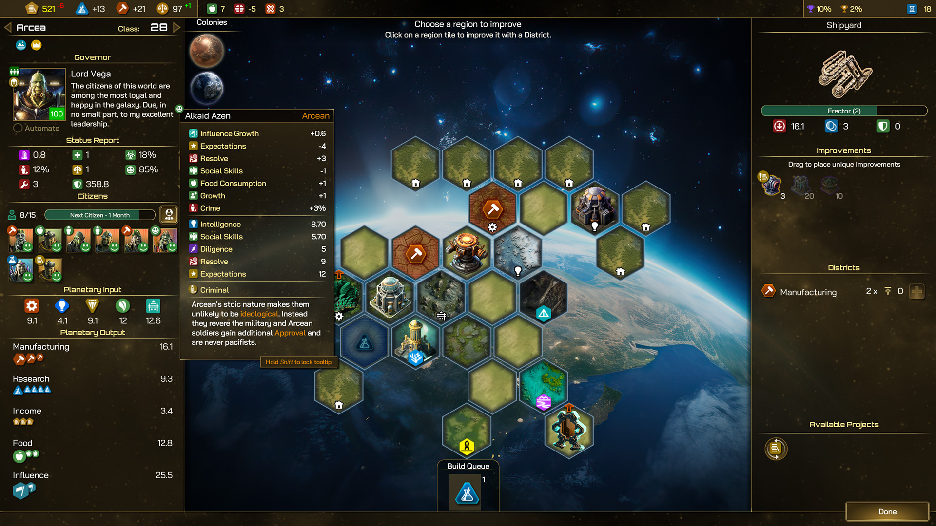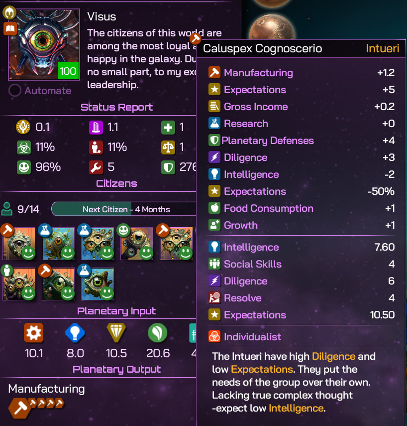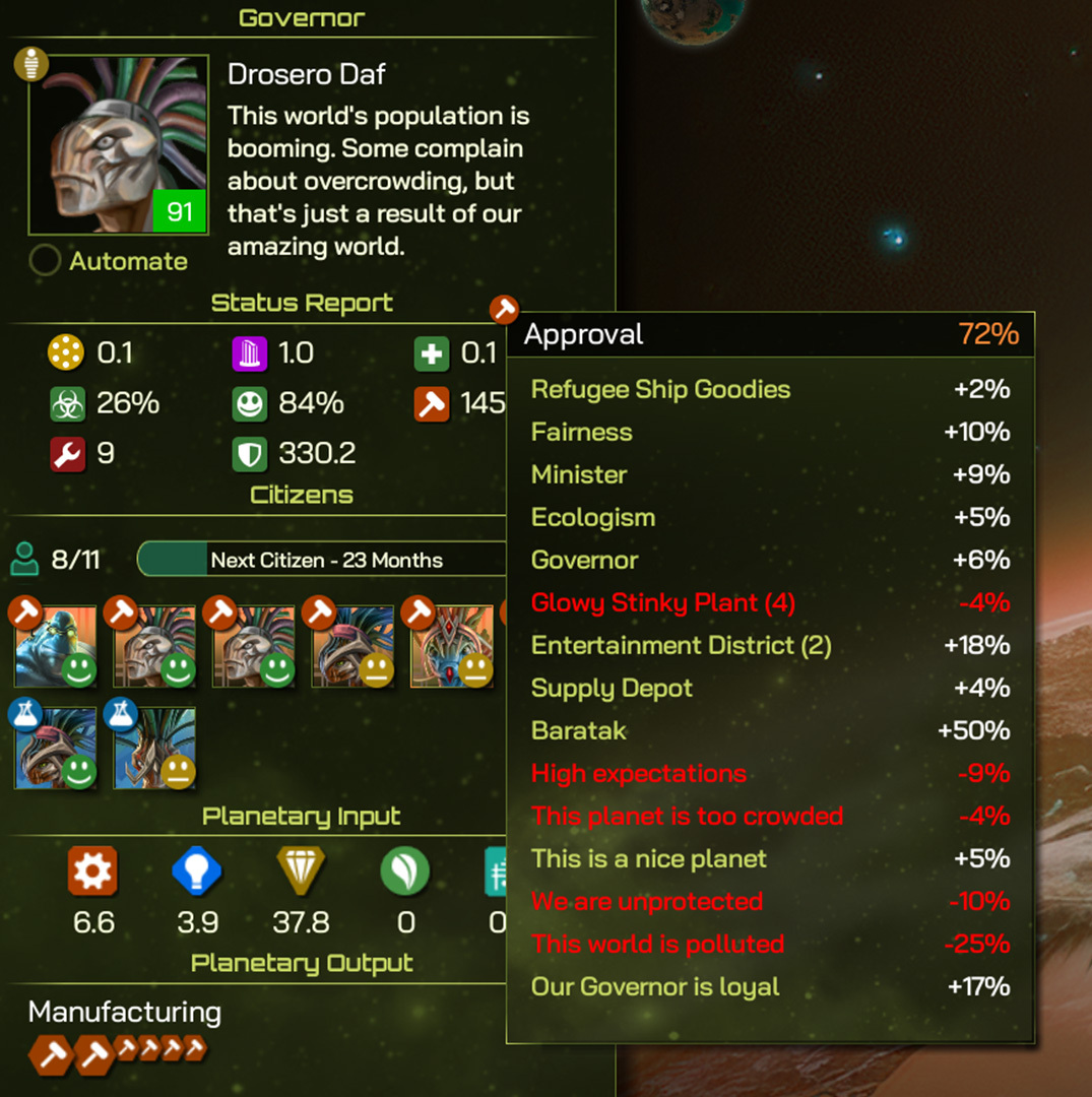 Citizens themselves have their own statistics and become a secondary form of industry that processes a Core World’s Planetary Input values into Planetary Output. Since each Citizen has its own Expectations and Approval score, keeping them happy is important since Approval is a direct negative multiplier that reduces your overall Research and Manufacturing scores, respectively.