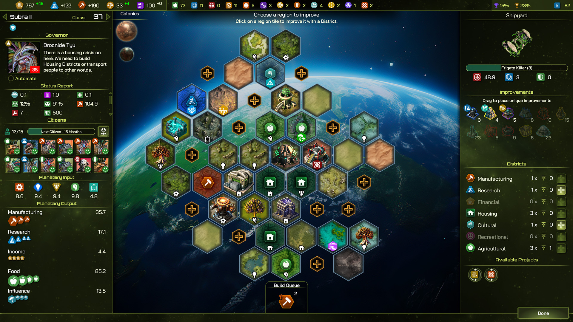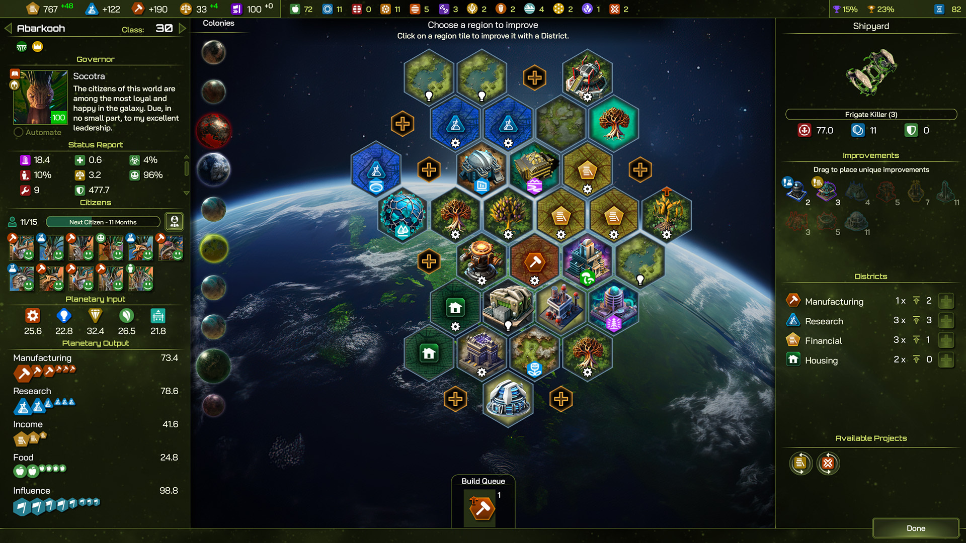 Here, you can see I’ve avoided building too many Manufacturing Districts or Improvements on their homeworld, focusing instead on Population Growth improvements and Housing so I can cram more clean-living little Baratak Workers in to build all those warship parts we need. The low Pollution helps keep them happy, and the non-workers will generate a good amount of Income and Influence too.