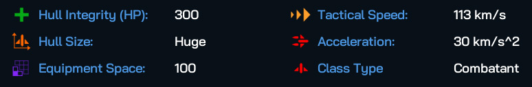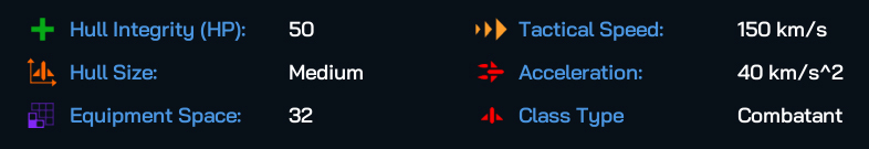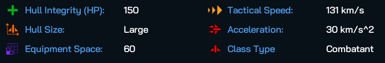 Medium hull sized warships show a remarkable increase in both Hull Integrity and the Mass of components that they can field, and are the first of the Ship Types that can comfortably carry the larger components, such as a Slipstream Accelerator (for a +1 Move for the entire fleet), while still holding enough weaponry and armor to remain competitive in a fraught fleet action. They’re also not a whole lot slower than Frigates or Corvettes either. With that extra Equipment Space, you can really go to town with designing interesting ship builds with these guys.
