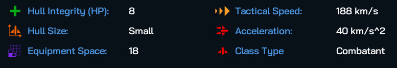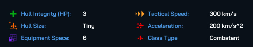Here are the statistics for Tiny hull sized ships: they’re fast, maneuverable and initially don’t have much space for components, at least until the eggheads in your science department figure out military component miniaturization! They’ll not take much punishment, which is why you’ll be fielding them in large numbers.