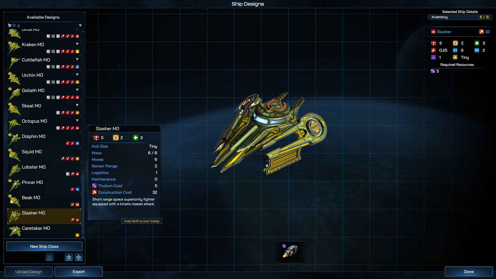 The smallest ships in the game are two Ship Types in the Tiny hull category, the Fighter and the Bomber. These smallest of combat vessels have a low mass, so less components, but are relatively fast and cheap to produce compared to larger hull sizes.