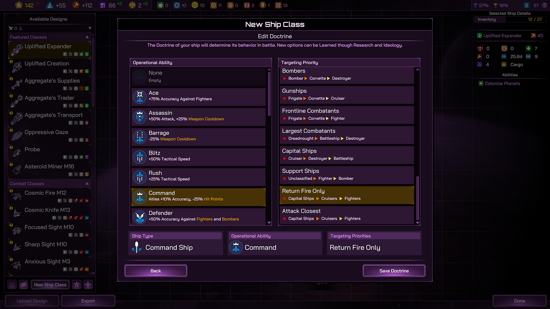 The Doctrines feature completely revolutionizes how players design, build, and utilize their ships in Galactic Civilizations IV. Combat Doctrines are composed of Operational Abilities and Targeting Priorities, which can be combined with Ship Type to create the perfect combat solution for even the most specific of warfare situations.