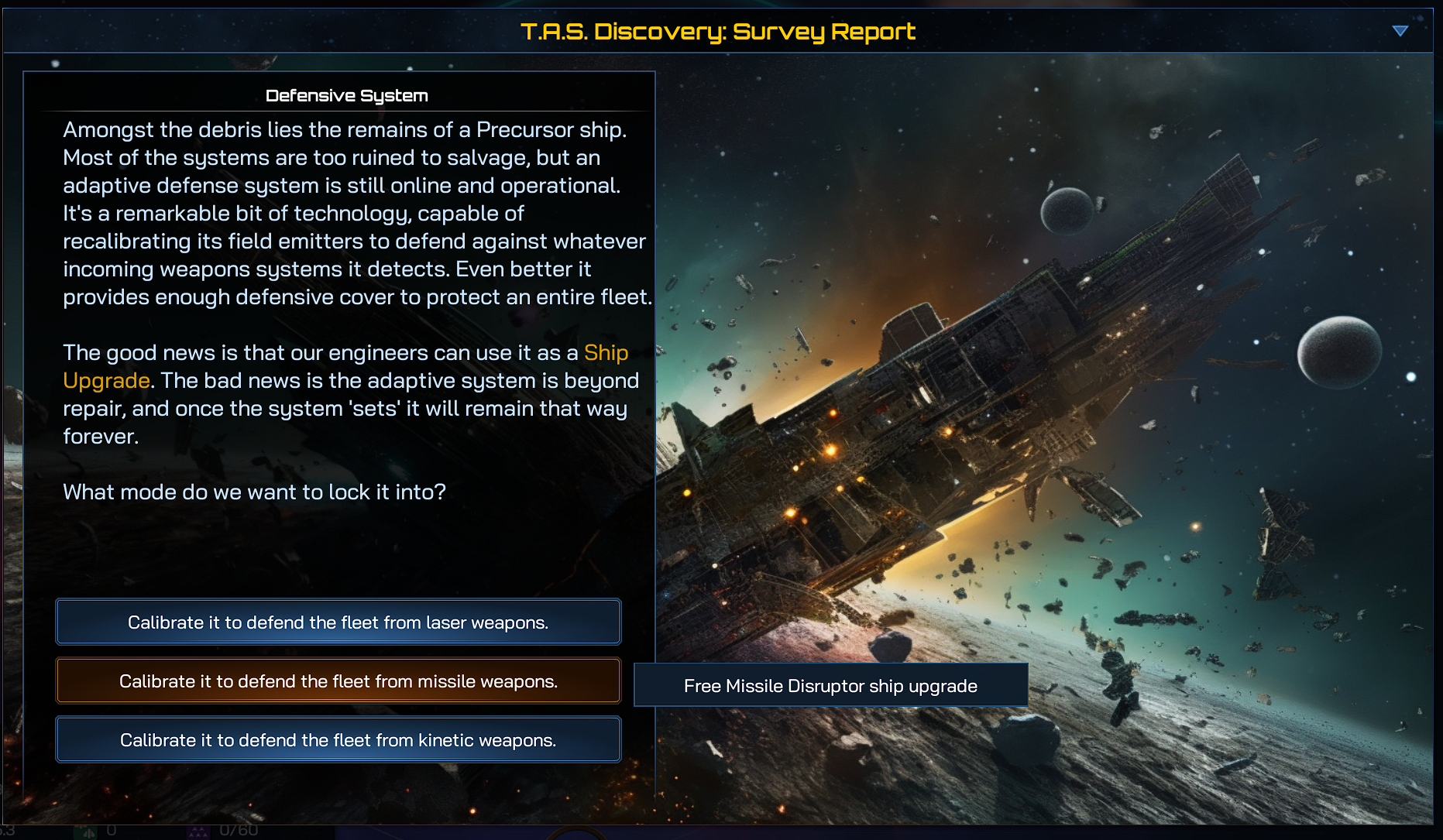 GalCiv IV gets rid of the rock-paper-scissors way of weapons vs. defenses. Instead, in GalCiv IV when an enemy attack reaches your ship, it first checks to see if its accuracy is better than your evasion in order to tell if it hits at all. Then, if it hits, the shields will see if they absorb the damage. And then any remaining damage goes to the armor which mitigates a % of it. However, with v2.5 we have made it so specific ship components can do special things. Some weapons can ignore shields for instance. Some defenses can thwart missiles. And so on. This allows players to counter enemy strategies that have focused too much on a particular area of weaponry or defense.