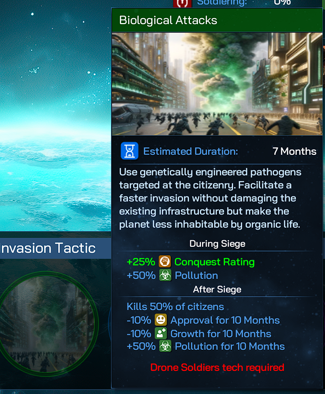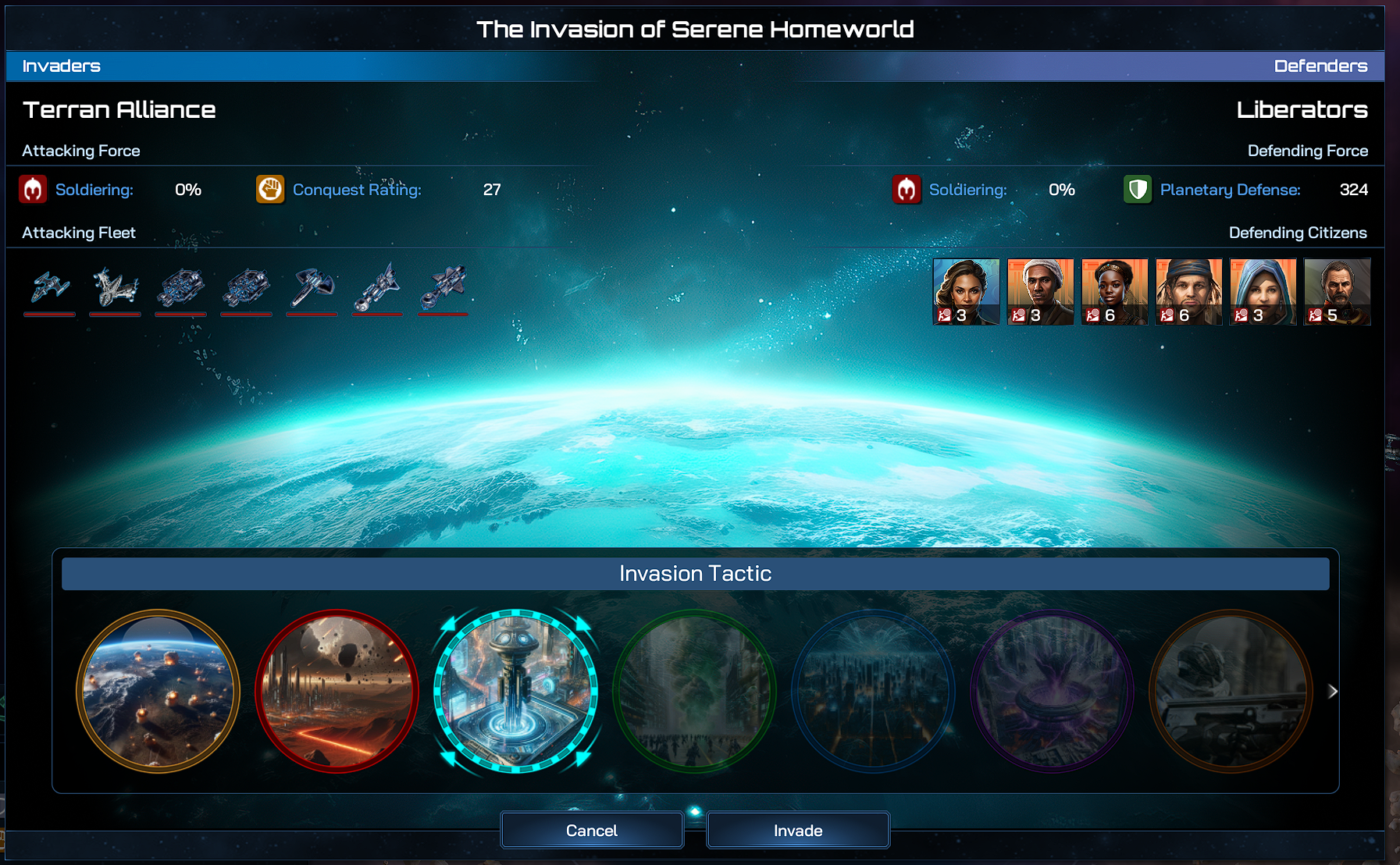 New to the Warlords expansion are various invasion tactics. Invasion Tactics allow you more control over the nature of Planetary Invasions. They allow the player to make interesting choices at the start of an invasion that affects casualties, planetary destruction, and the duration of the Invasion.