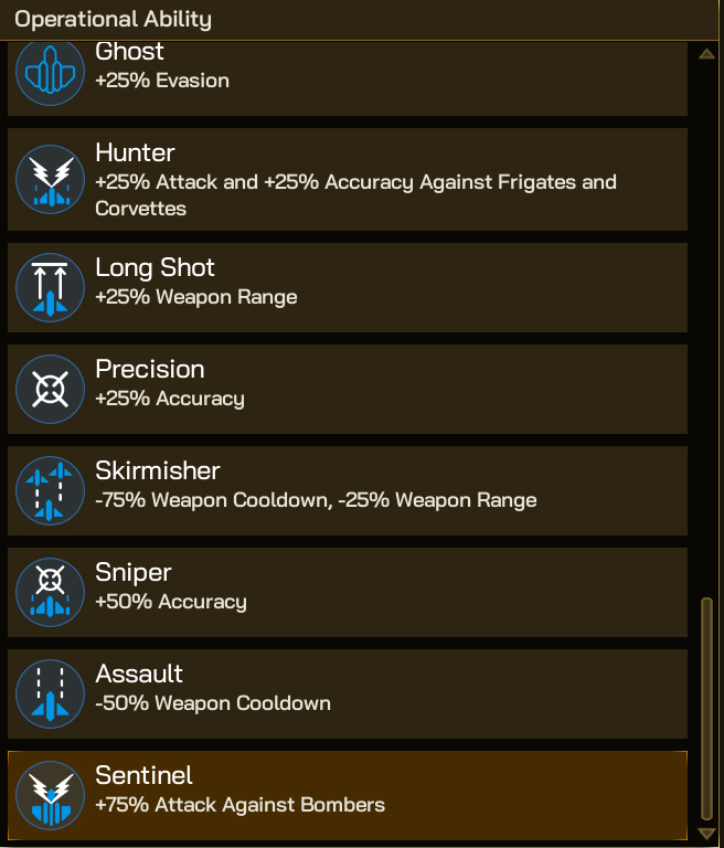 Looking through the Operational Abilities available, there are a few options but the best one for targeting Bombers is Sentinel, with it’s +75% Attack Against Bombers ability. This will help reduce shielding and armour, and do more HP damage once they’ve mitigated those protective measures.