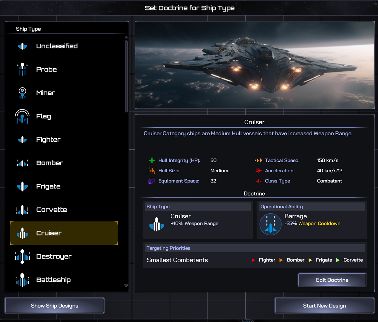 Remember that a Ship Class’s doctrine can be changed at any point during play using the Edit Doctrine button in the ship designer, without the need to redesign the ship itself, meaning you’re free to experiment and repurpose the role of your Classes to adapt to an ever shifting battlefield.