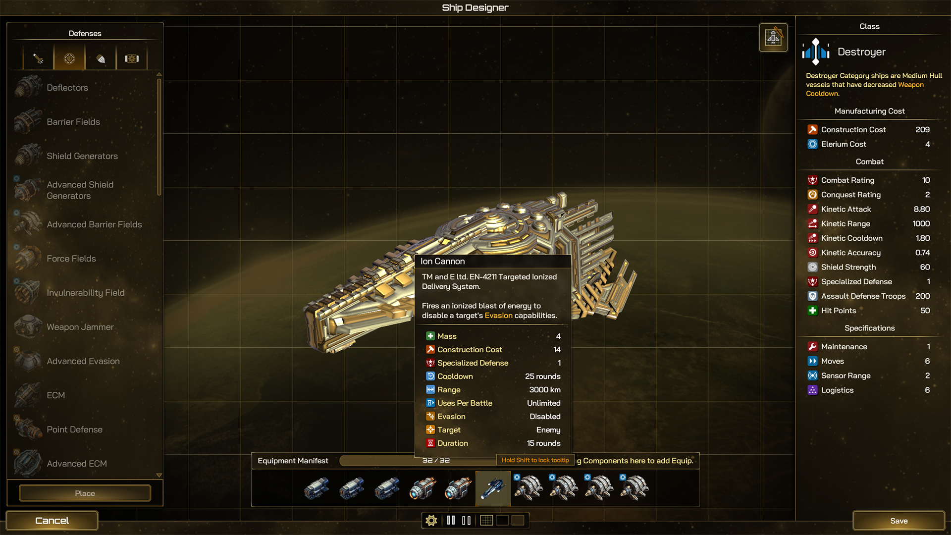 Throw in substantial shielding (hope you’ve found some Elerium!) and an Ion Canon to negate the Bomber’s evasion and now those big swarms of terrifying capital ship killers are going to be easy prey for your deadly Destroyers!