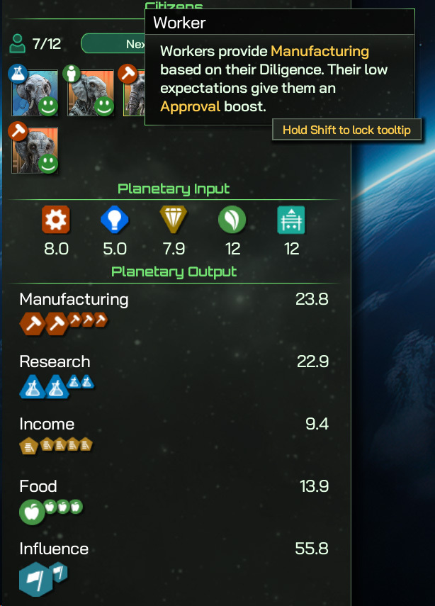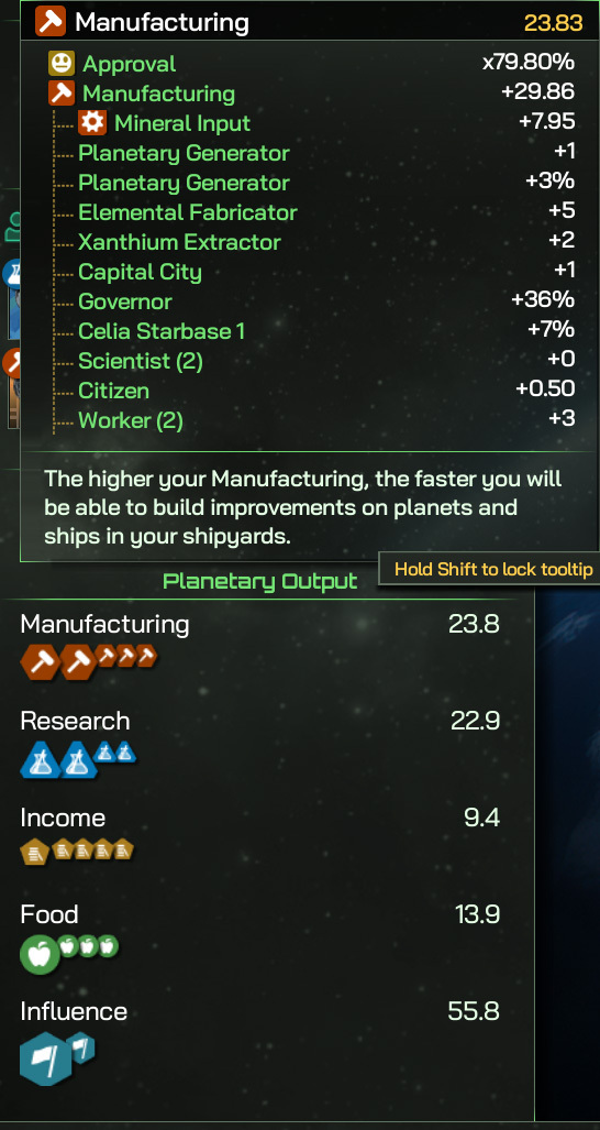 This Mineral Input is then processed by Manufacturing Districts, any manufacturing Improvements (like the Planetary Generator and Elemental Fabricator here), and some other bonuses such as our Governor’s Diligence score (Diligence is a character trait used to modify Manufacturing), and the various Diligence scores of our Citizens too.