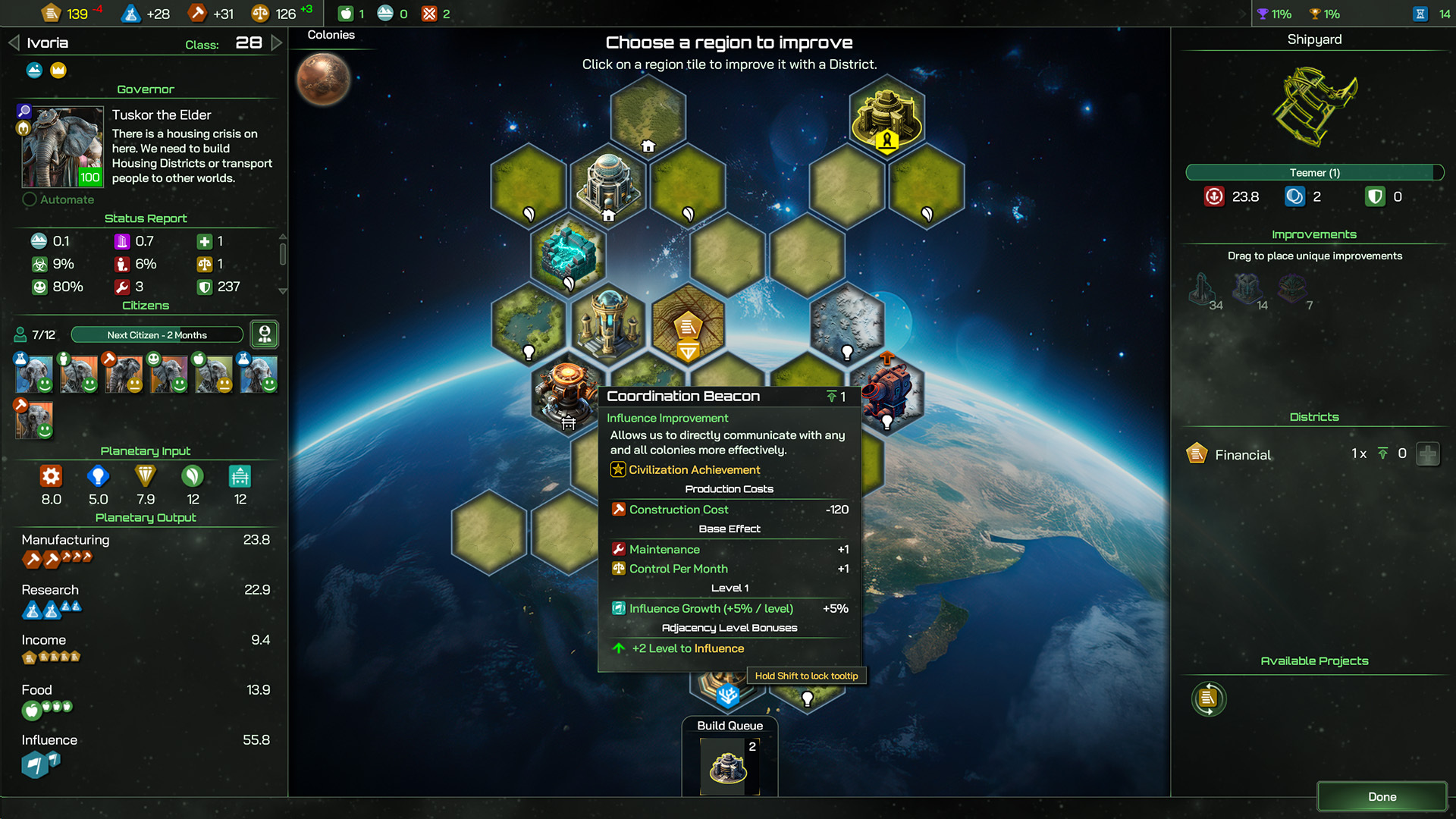 So, what can we do with this Manufacturing output? Well, every construction project on our planet has a Construction Cost, and our Manufacturing score is deducted each turn from that cost until the total cost is paid, at which point you get your shiny new Coordination Beacon, in the example above, which required a total of 120 Construction points to create.