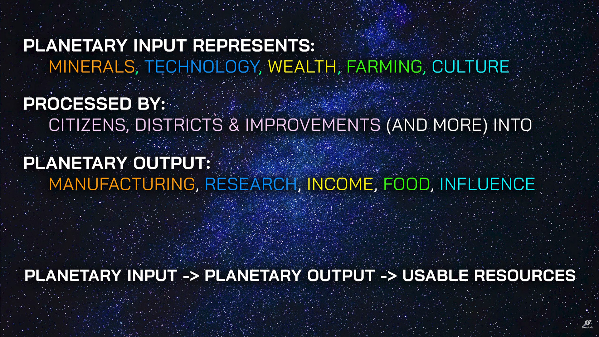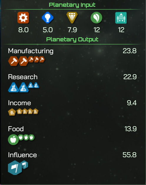 As a quick recap, natural resources are represented as Planetary Input, which are then converted by Citizens, Districts and Improvements (and a few other miscellaneous things) into Planetary Output. Manufacturing and Influence are used at the planet level, for colony construction and shipbuilding, and pushing out your borders respectively.
