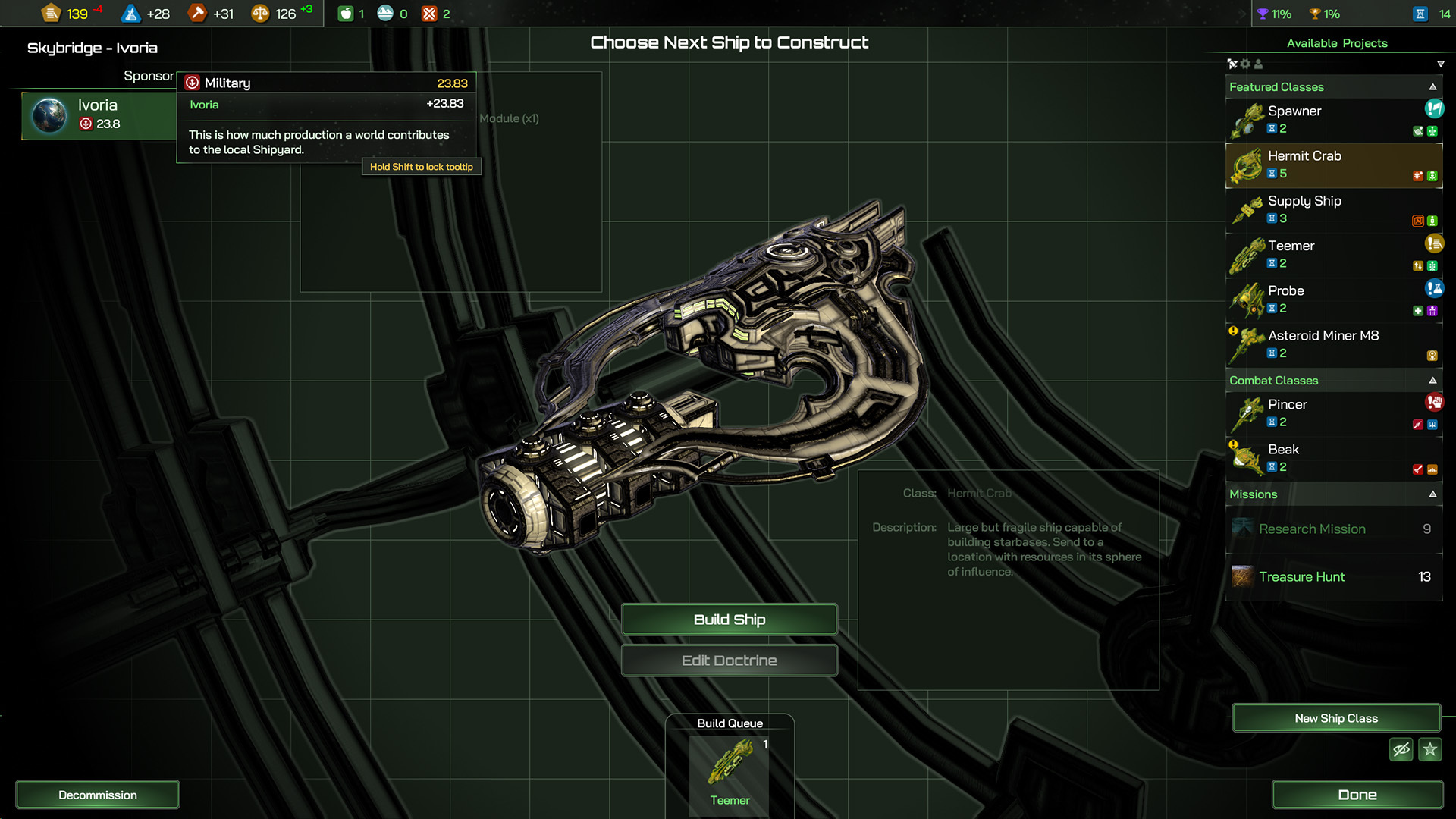 That Manufacturing score is also translated into another resource called Military, which is basically the same as Manufacturing Output, but is used by your attached Shipyard to create shipyard projects (warships, research missions, starbase modules and more).