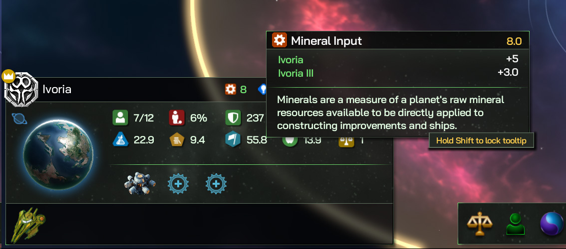 The Core World of Ivoria here has mineral resources called Mineral Input, worth 5 points. We’ve also got a Colony attached, Ivoria III, which is contributing it’s own Mineral Input of 3, for a total of 8.0. If we had Asteroid Bases around Ivoria, you’d see their input here too.