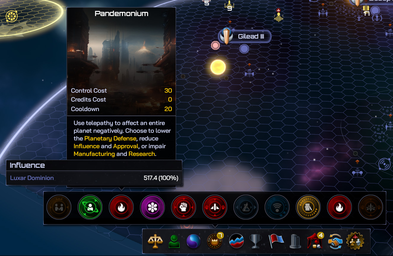 Reducing Influence and Approval suppresses the Citizens on the planet and slows the growth of cultural borders, Manufacturing, Military and Research. Playing this on an important Core World, such as Earth as shown in the screenshot below, could have a dramatic effect on the enemy’s economic and cultural output.