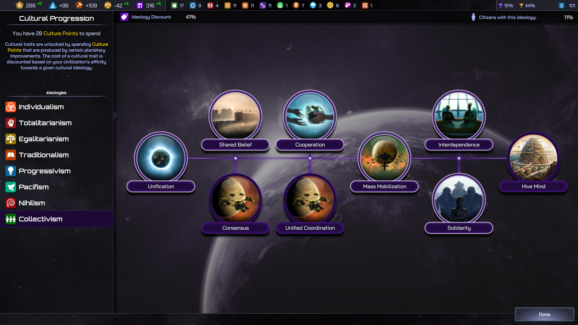 Unification grants a decent Influence boost in the early game, helping expand their borders out a bit faster to counter their slower colonization efforts. It can be tempting to grab both Shared Belief and Consensus to fully leverage the power of Citizens with the Collectivism Ideology and dramatically improve planetary outputs (through increased Approval) as a result. Unified Coordination and Mass Mobilization are war focused Traits and increase both wartime Manufacturing rates and the maximum size of your fleets.