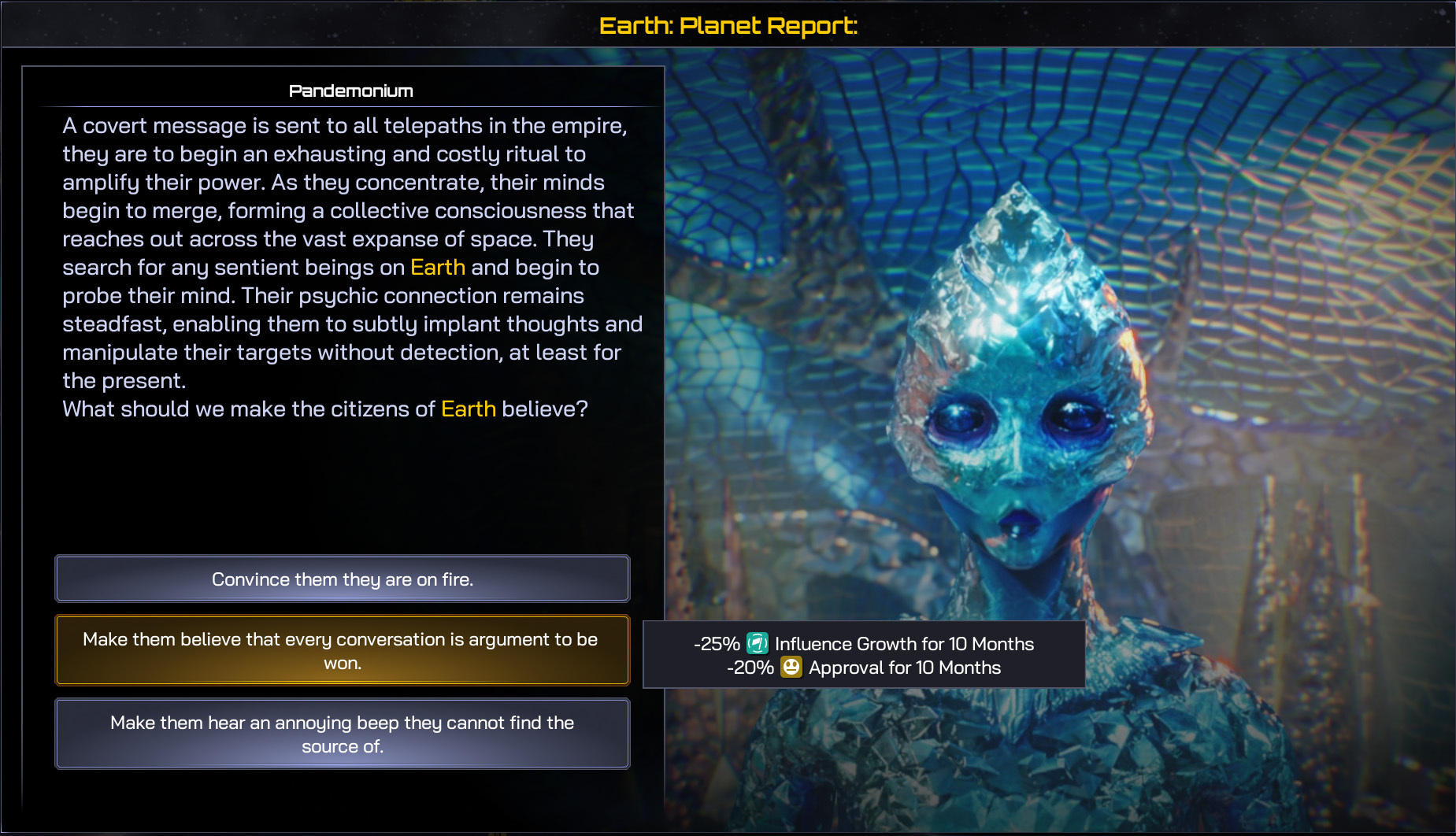 Furthermore, to bolster their offensive and defensive strategic capabilities, the Telepathy ability grants access to two active use Executive Orders, both of which are really fun because they give you options in the form of an Event.