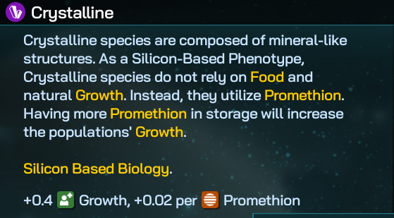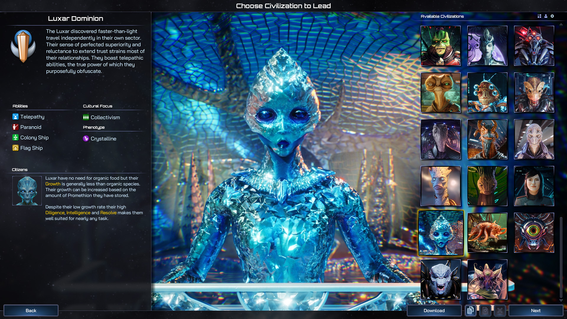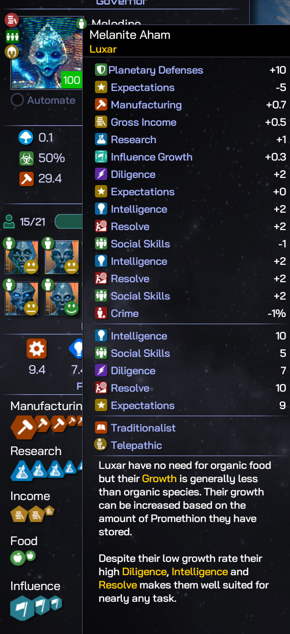 The Luxar are a civilization made up of Citizens with the Crystalline Phenotype, who need no Food but will reproduce very slowly until significant amounts of Promethium are stockpiled. To make up for this, they have fairly high Statistics compared to your average humanoid, with high Diligence, Intelligence and Resolve ensuring you get more out of your Citizens than most other Civilizations.