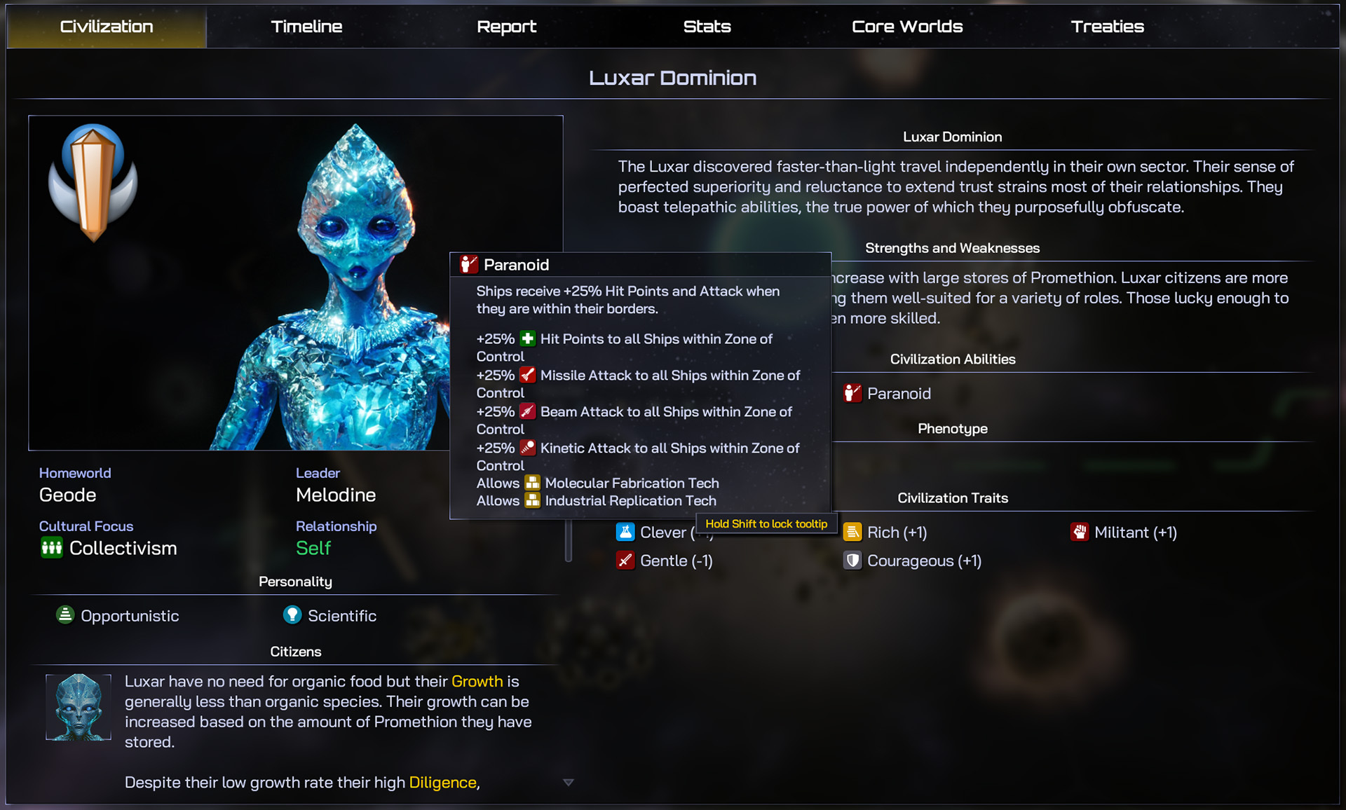 The Luxar Dominion’s preferred Ideology is Collectivism, which grants access to some very useful supporting Ideological Traits.