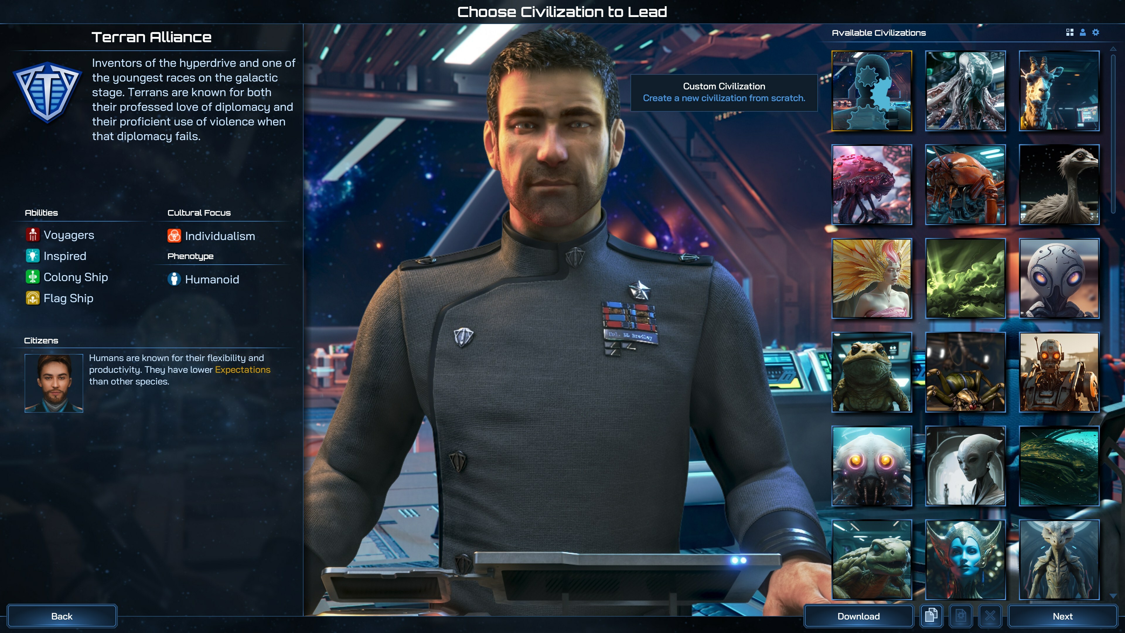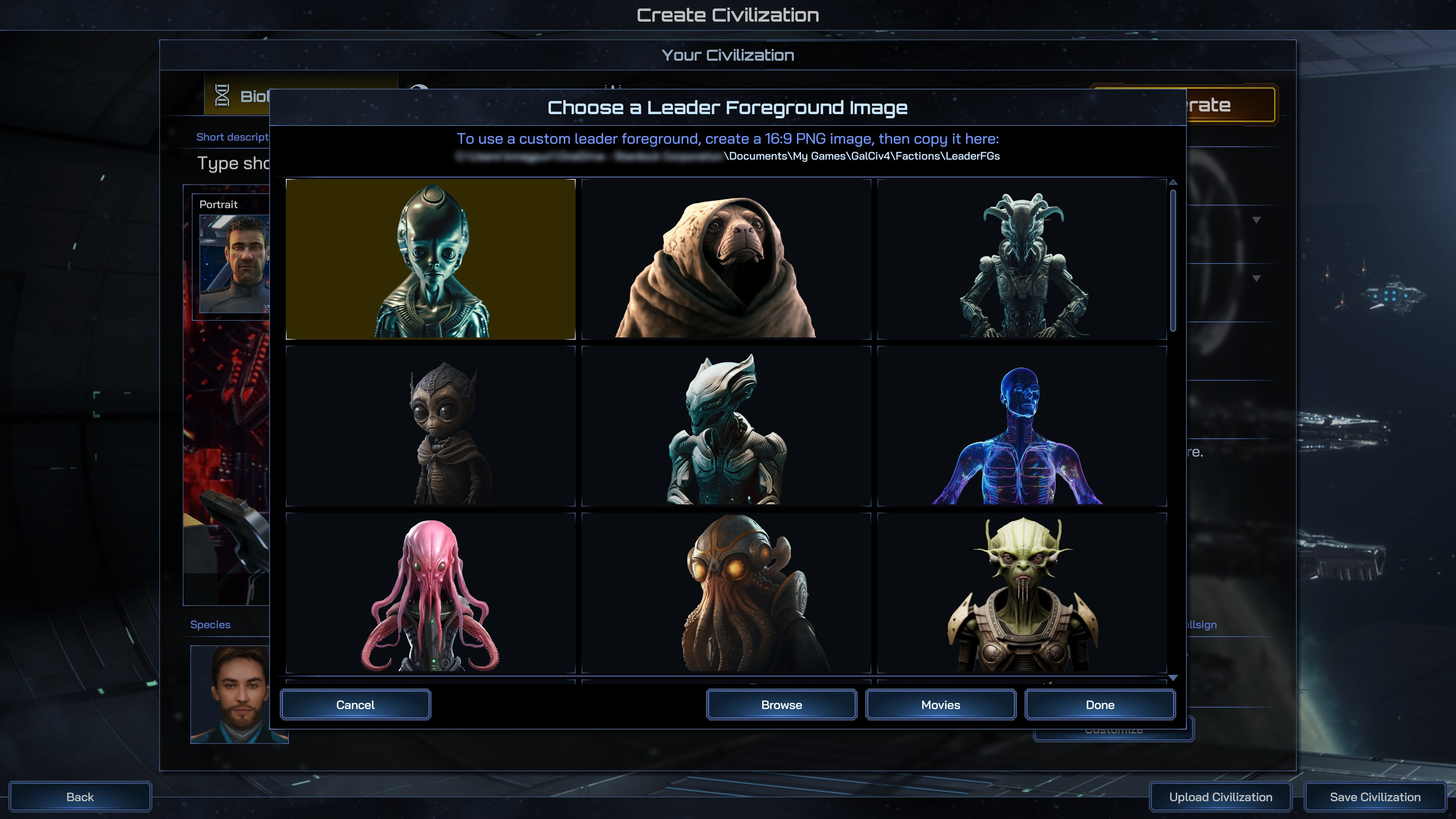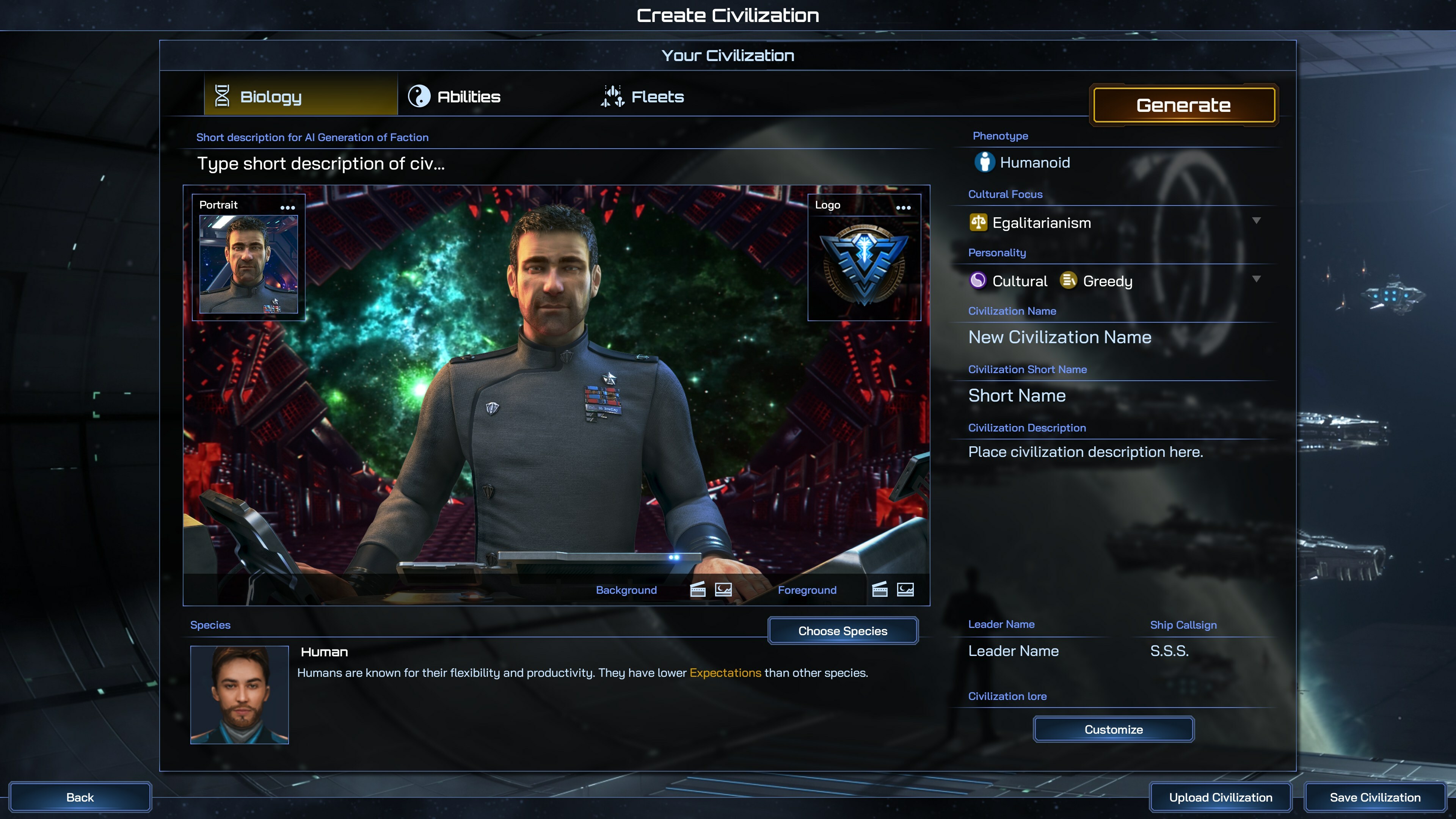 The journey starts in the Biology tab, where you can infuse your custom civilization with personality and flair. Here, you can name your civilization, select a portrait for its leader, determine the Species of its Citizens, and more. Each of these elements is customizable, and you can even add new images by placing them in the appropriate folder.