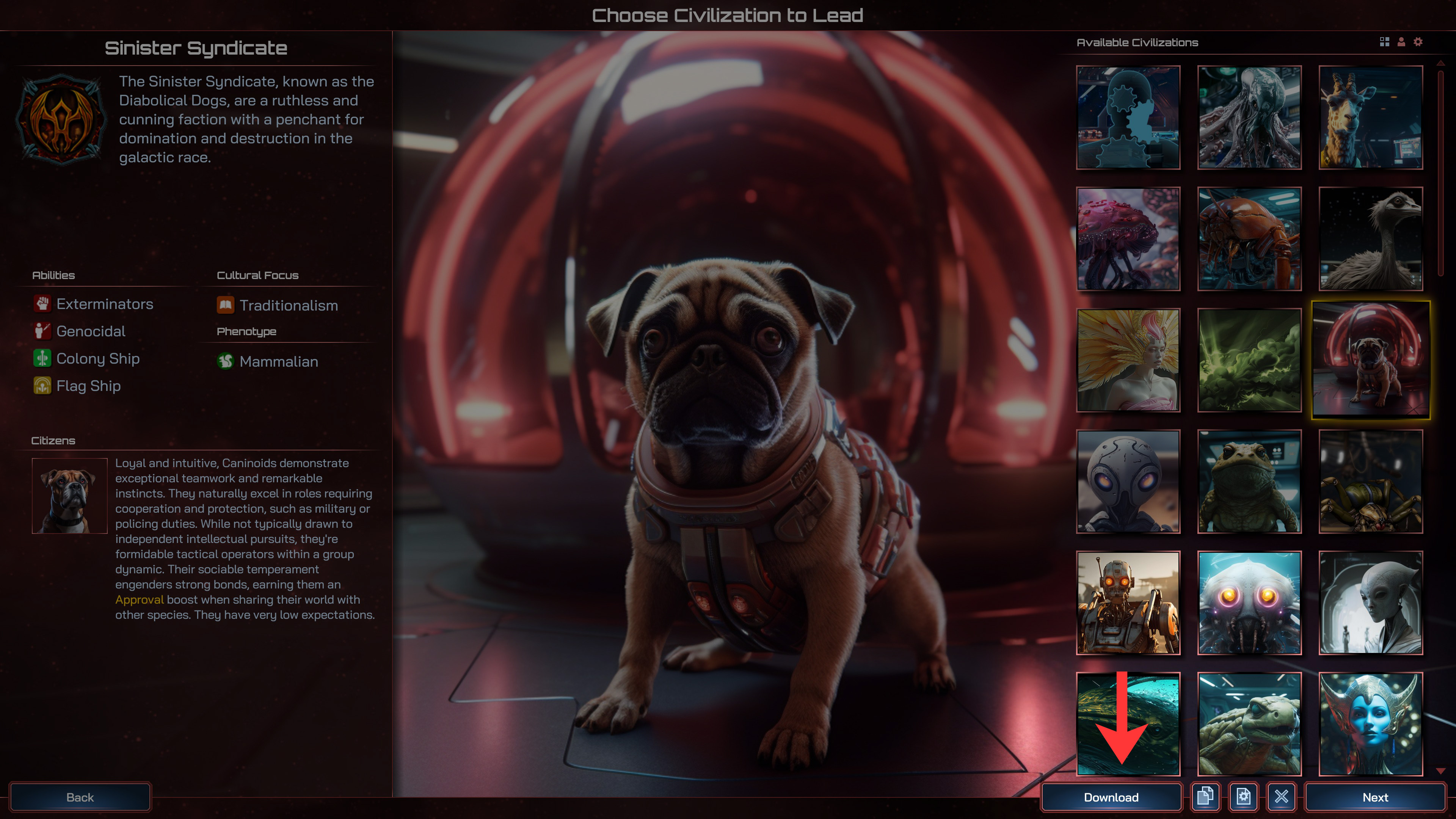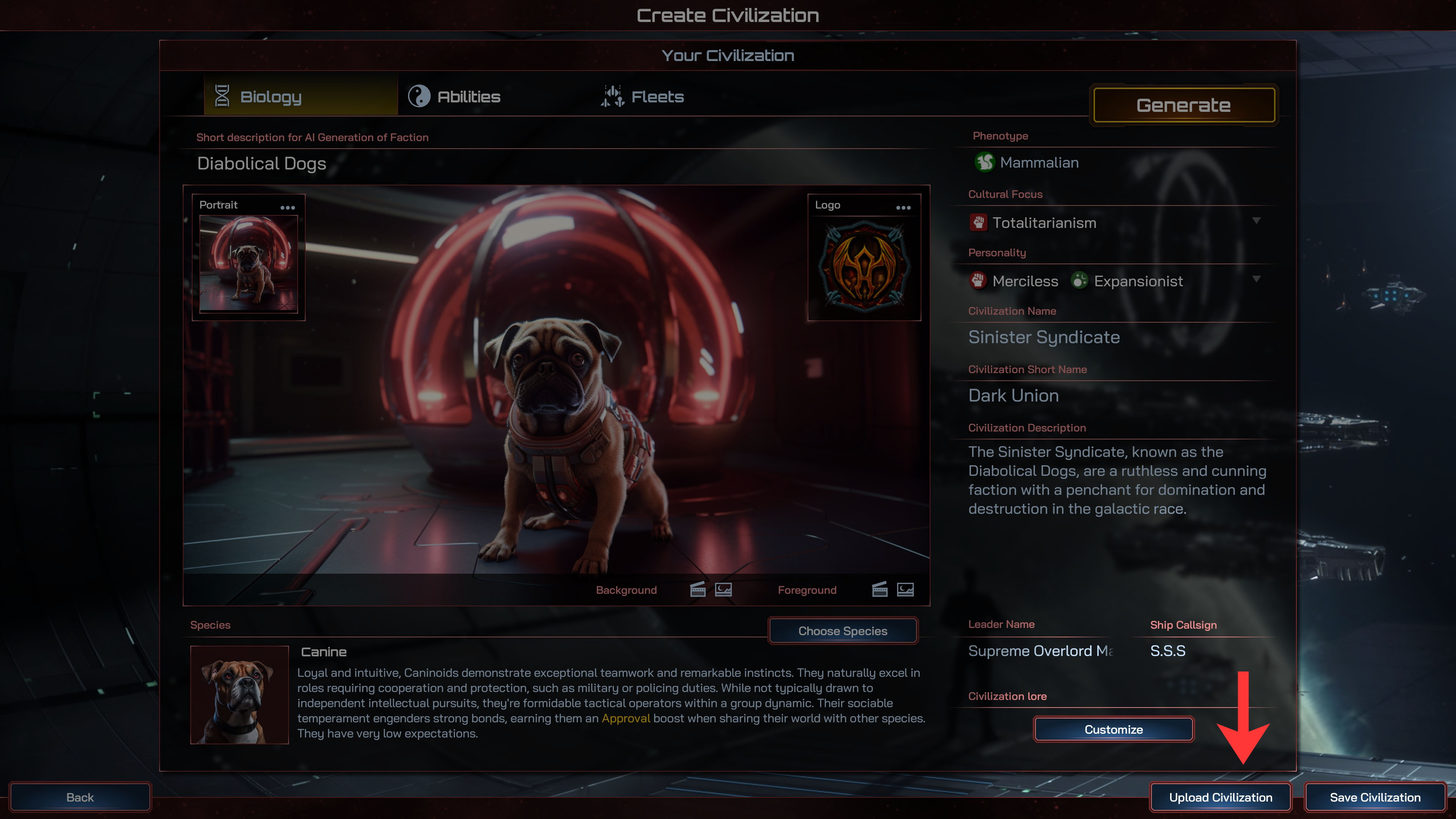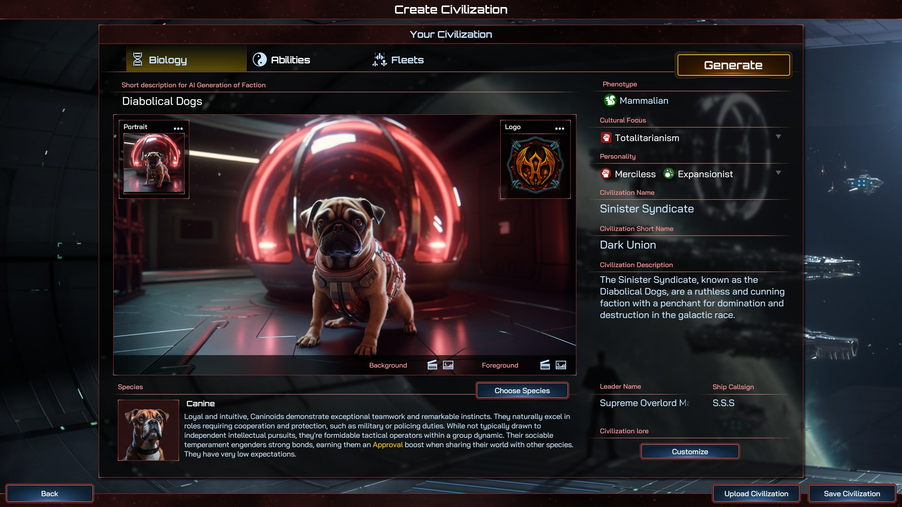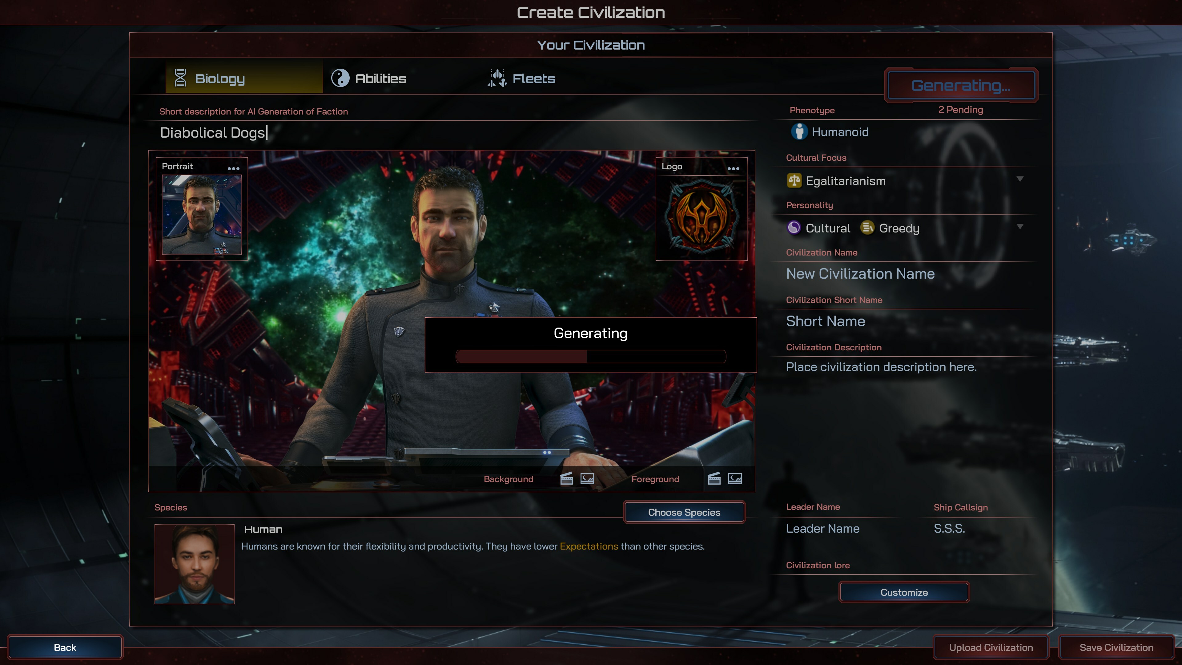 The journey starts in the Biology tab, where you can infuse your custom civilization with personality and flair. Here, you can name your civilization, select a portrait for its leader, determine the Species of its Citizens, and more. Each of these elements is customizable, and you can even add new images by placing them in the appropriate folder.